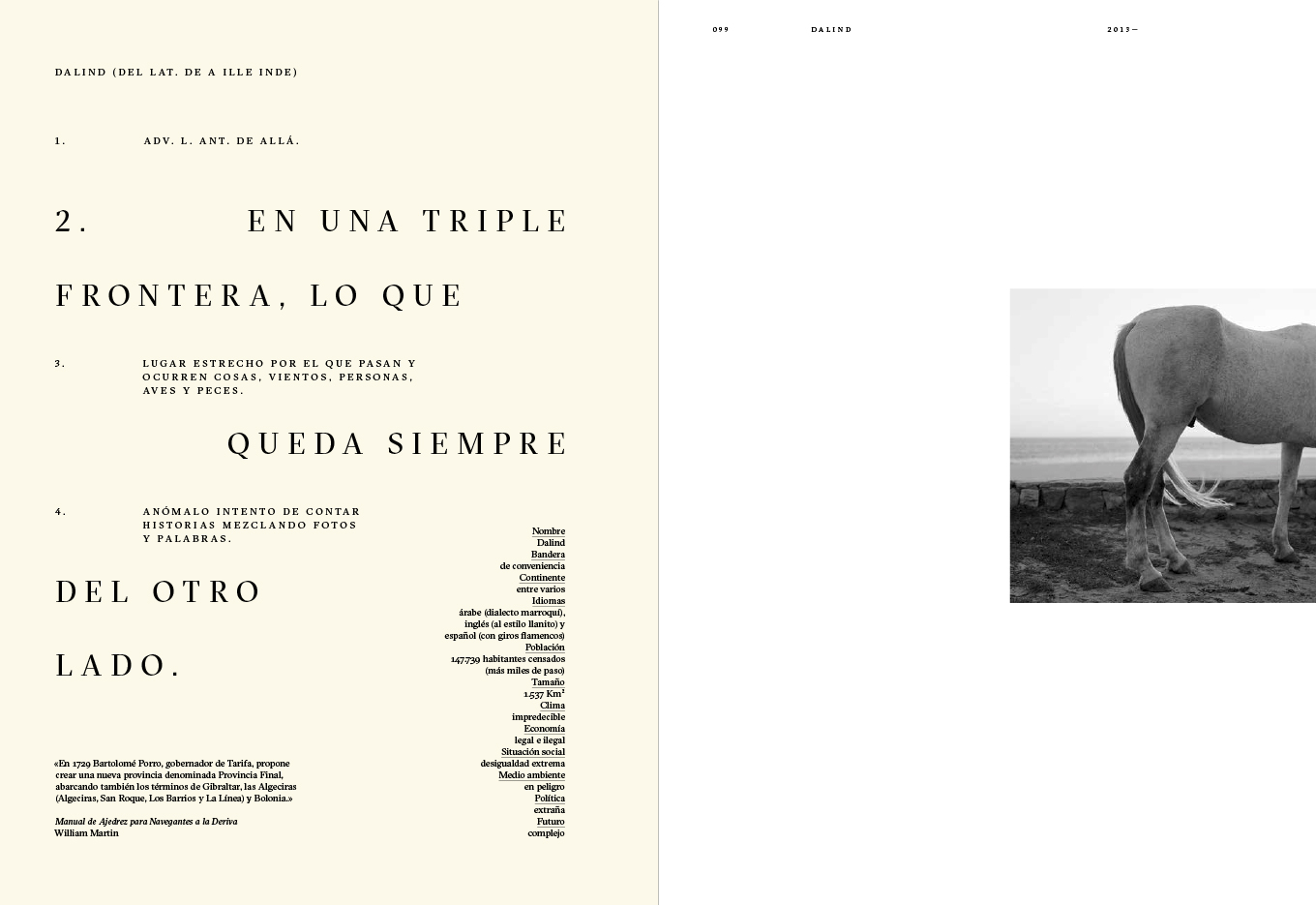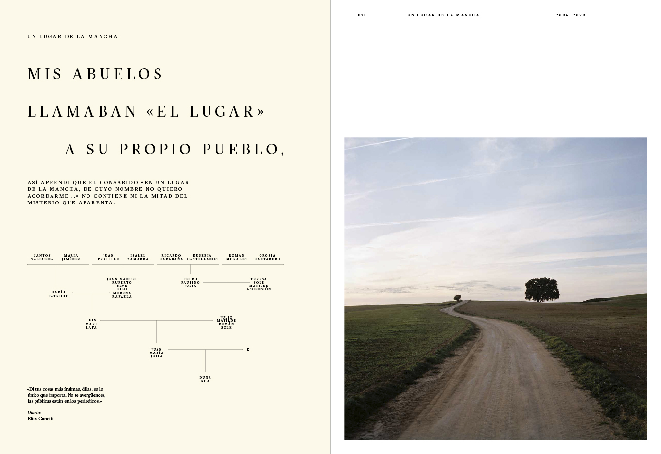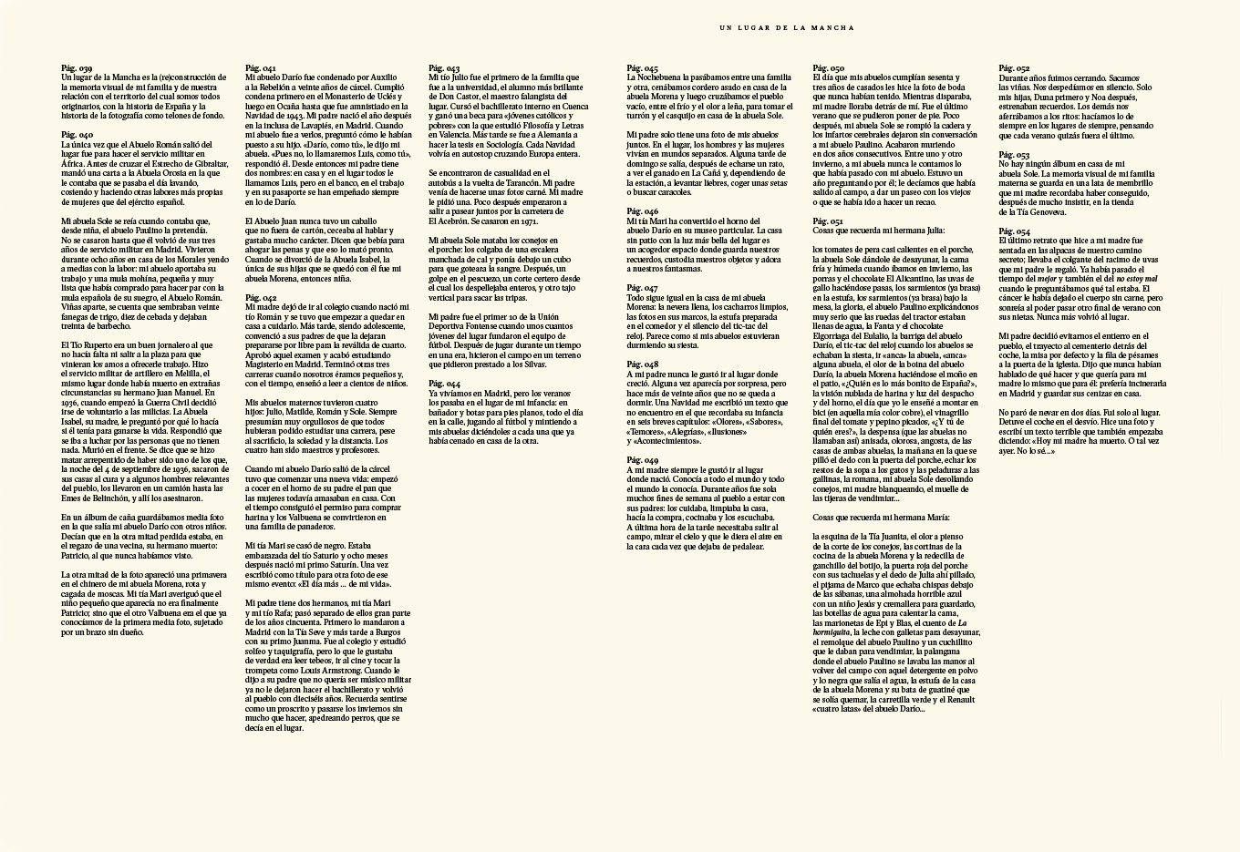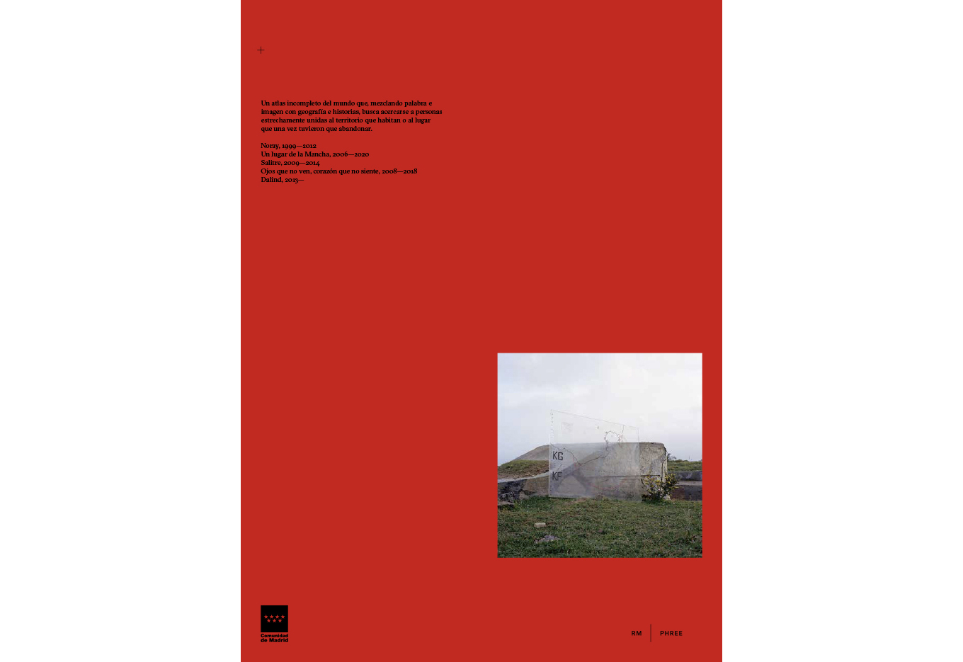 An incomplete atlas which, by combining words and images with geography and personal histories, seeks to explore the lives of people closely connected to the territories they inhabit or to the places they once had to abandon. (Featuring: Noray, 1999-2012 Un lugar de la Mancha, 2006-2020 Salitre, 2009-2014 Ojos que no ven, corazón que no siente, 2008-2018 Dalind, 2013- )