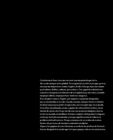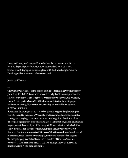 “Images of images of images. Texts that have been erased, rewritten, torn up. Signs, figures, bodies, enclosures washed away by water. Stones crumbling upon stones. A place with dust now hanging over it. Dwelling without memory, who owned you?” (José Ángel Valente) Turning the pages of this album, I’m reminded of Gonzalo Suárez’s words: “it doesn’t matter much if you live a long time or a short while, because you only live for an instant.“