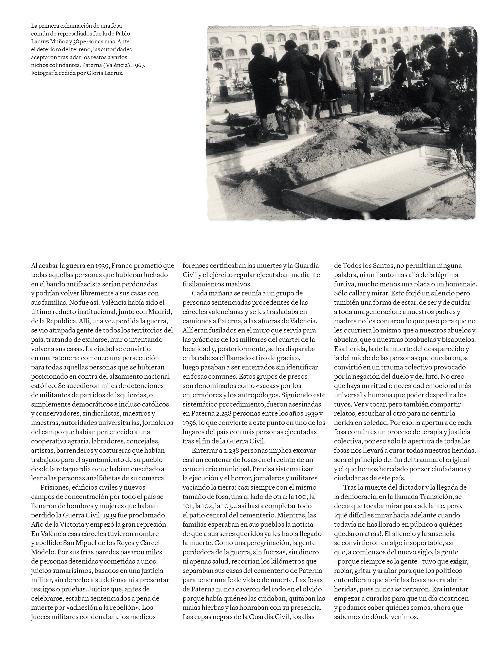 Este libro es el resultado de casi ocho años de seguimiento alrededor de las fosas comunes de Paterna (València). Fosas que albergaban a 2.238 personas asesinadas por la dictadura entre 1939 y 1956. Una vez terminada la guerra y prometida la paz. Pero también es la historia de una herida, de un trauma, de un punto ciego que no nos han contado.