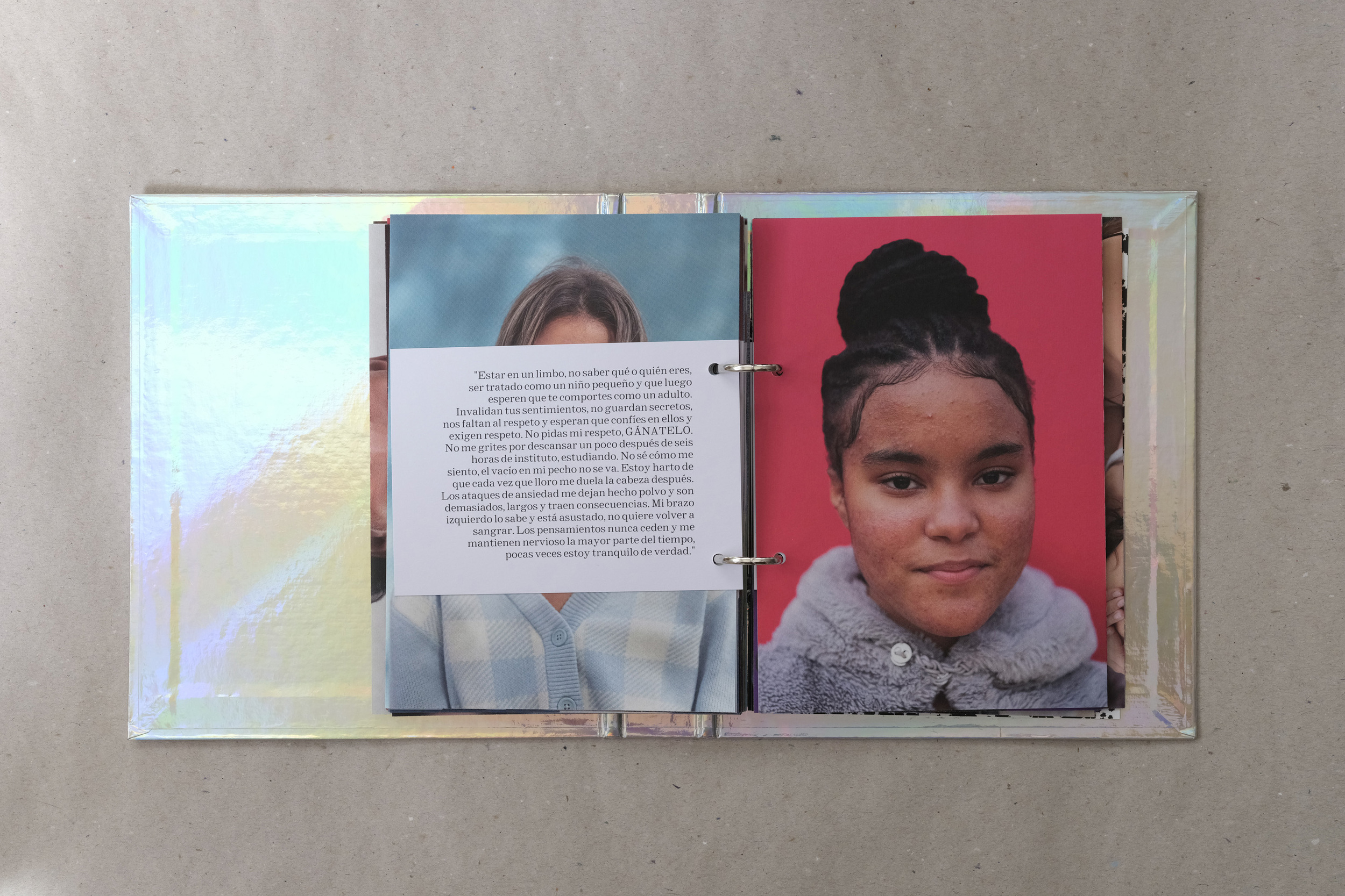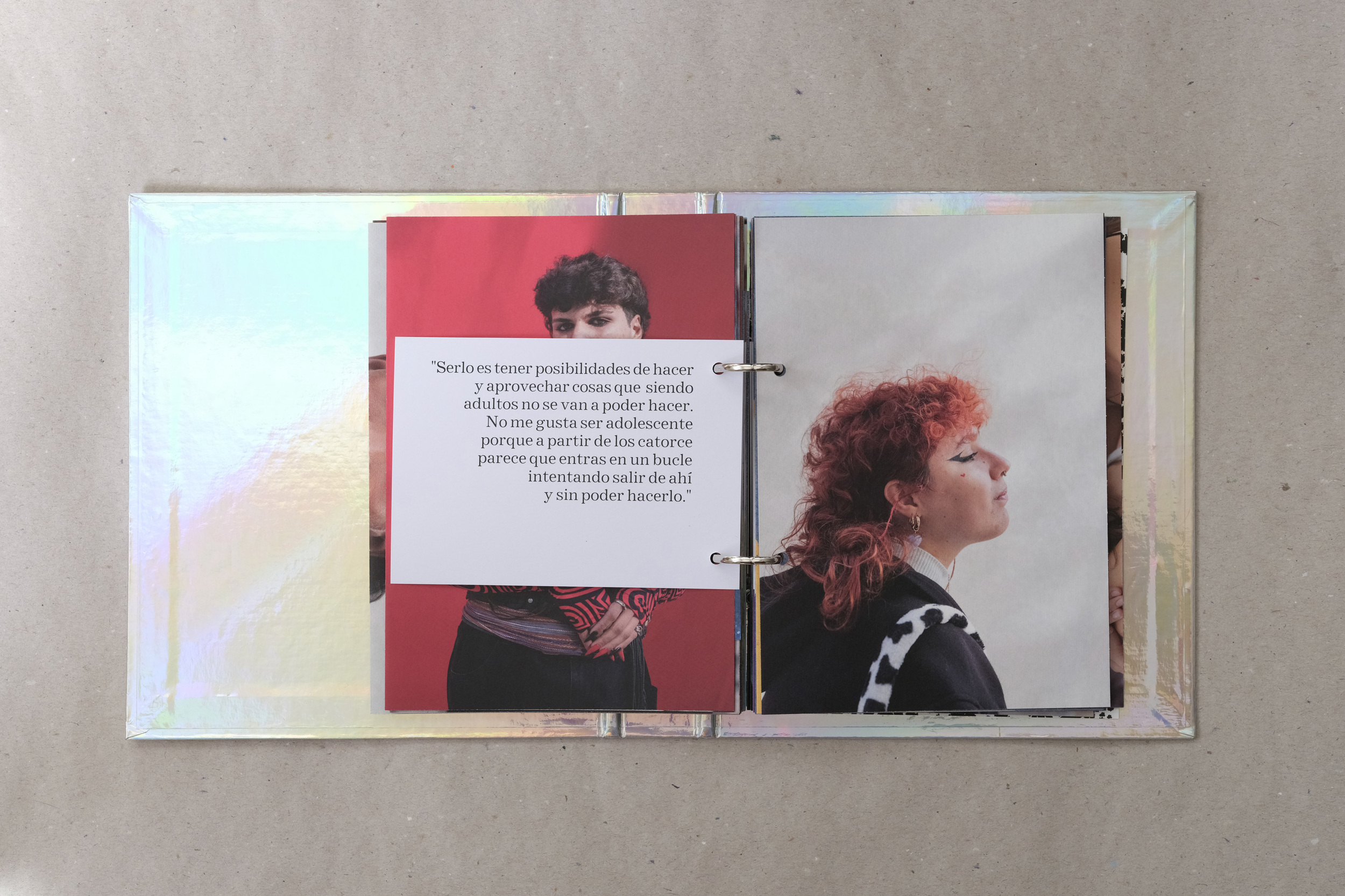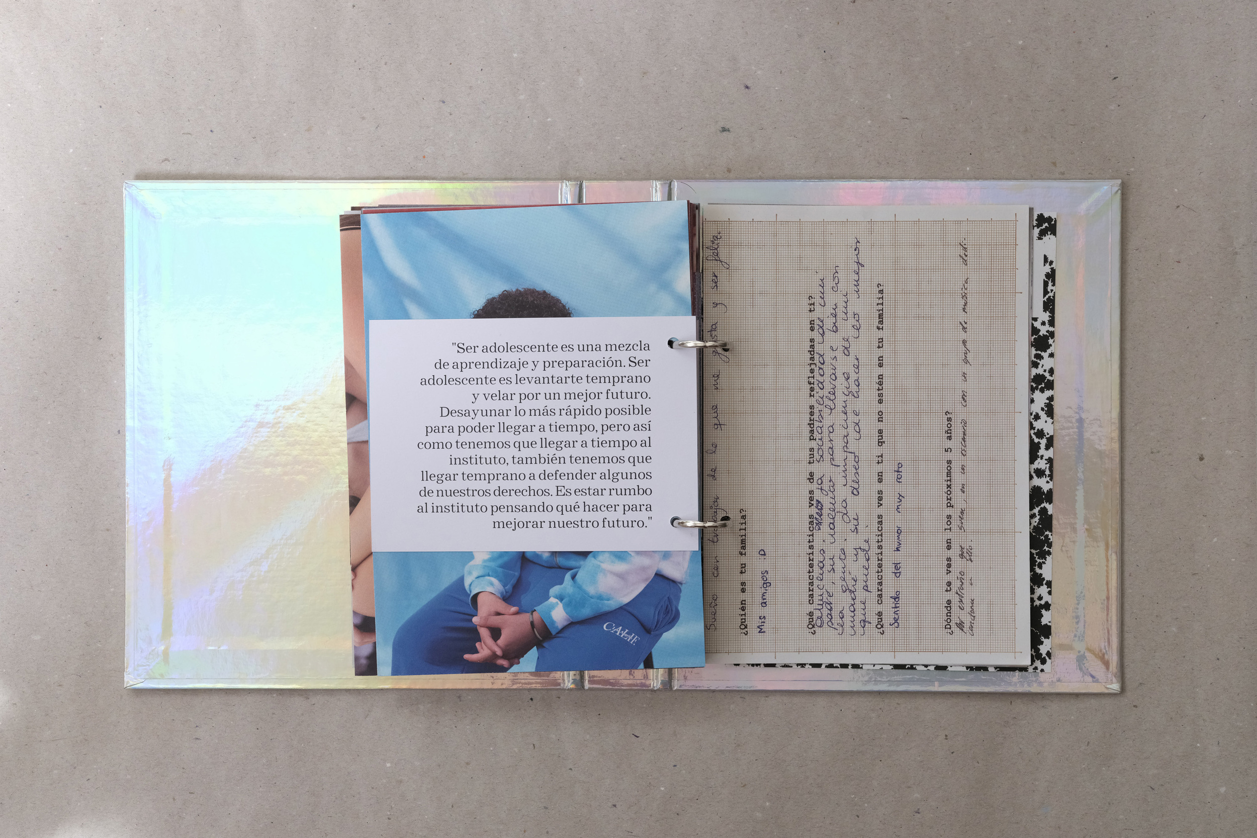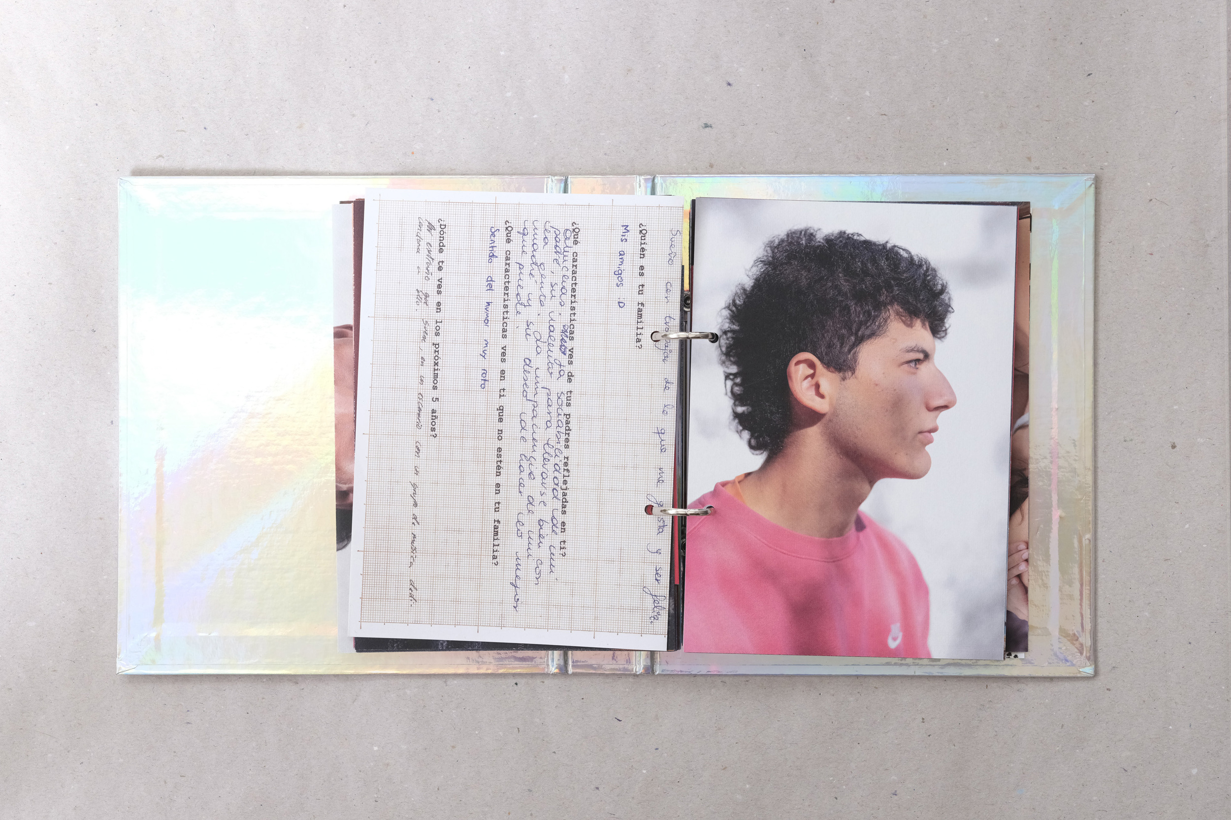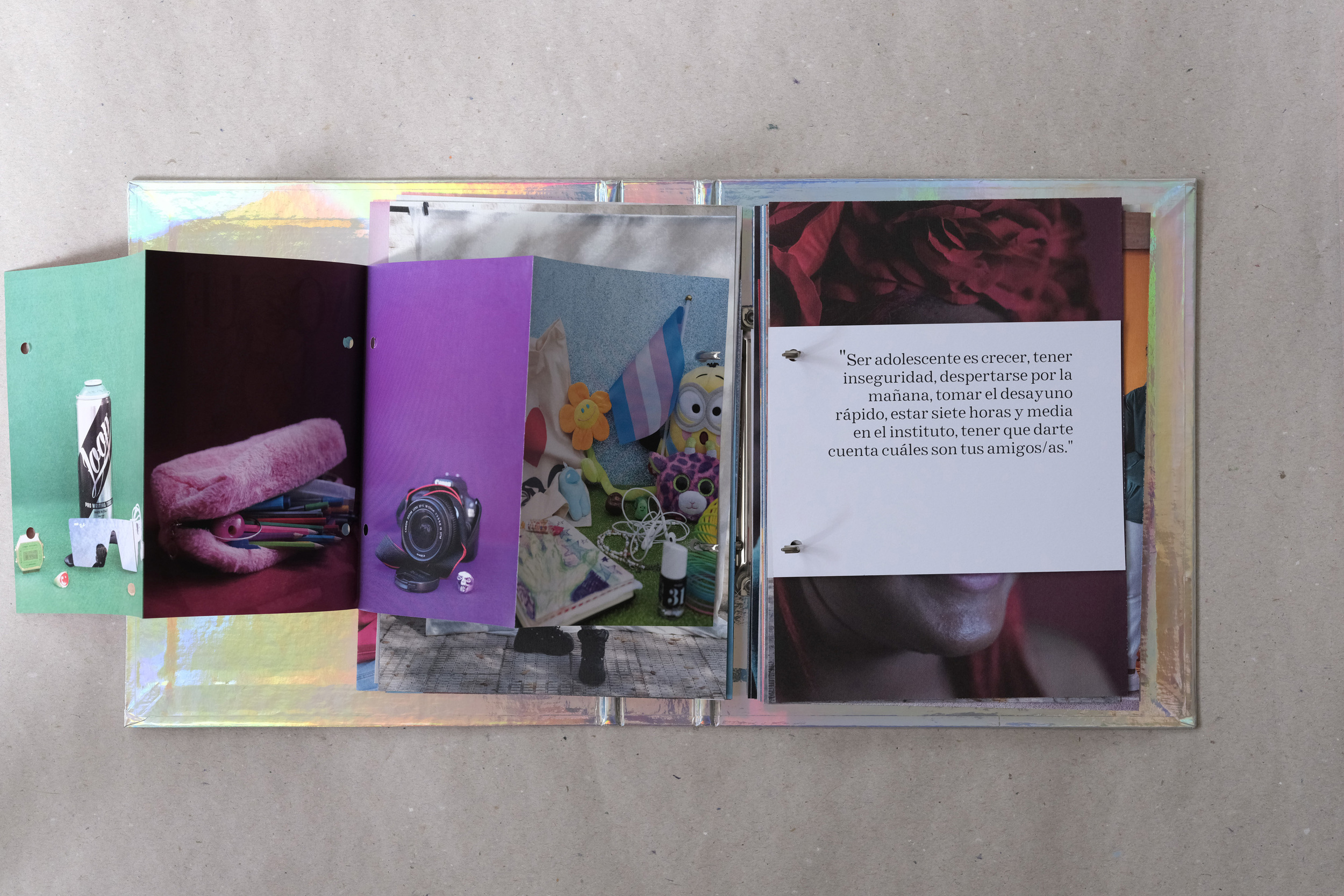 Un proyecto colectivo de autodefinición adolescente recogido en un archivador iridiscente con retratos, objetos y palabras en diferentes piezas, fichas y desplegables.