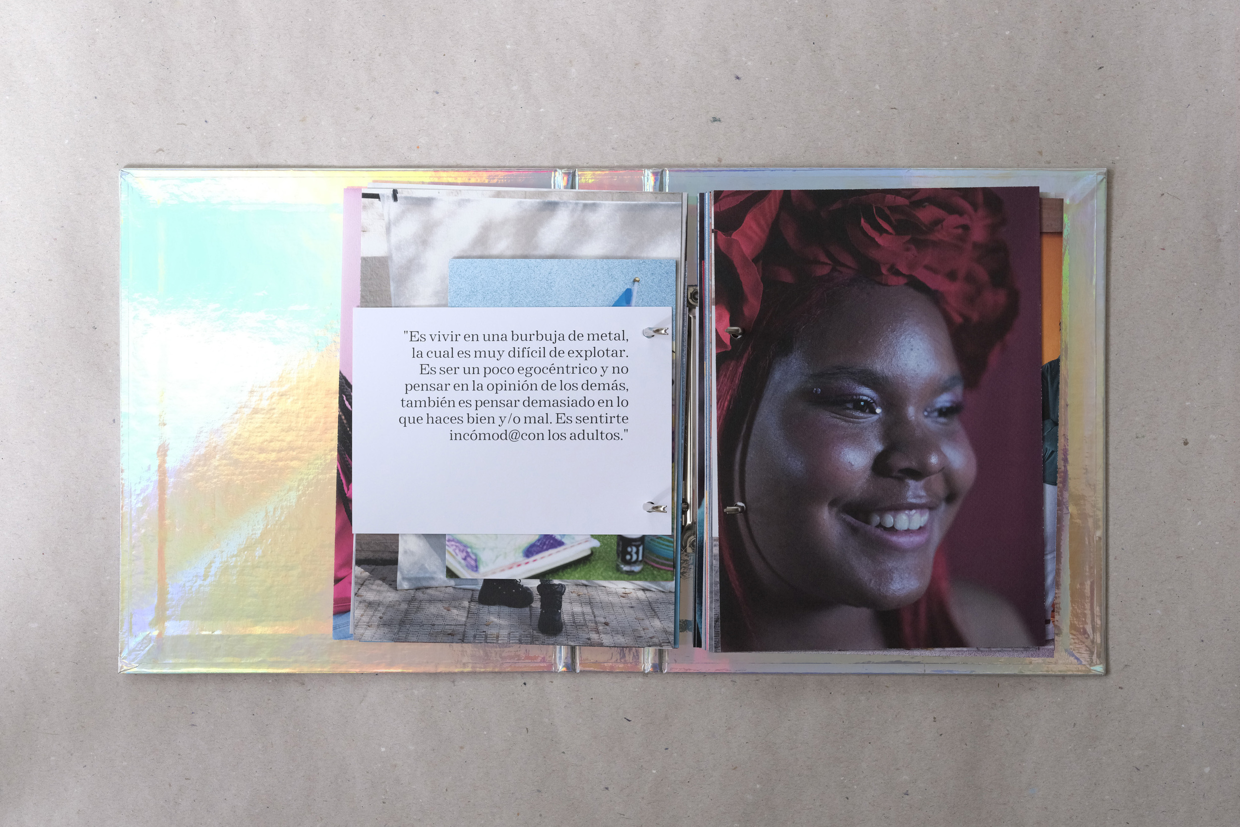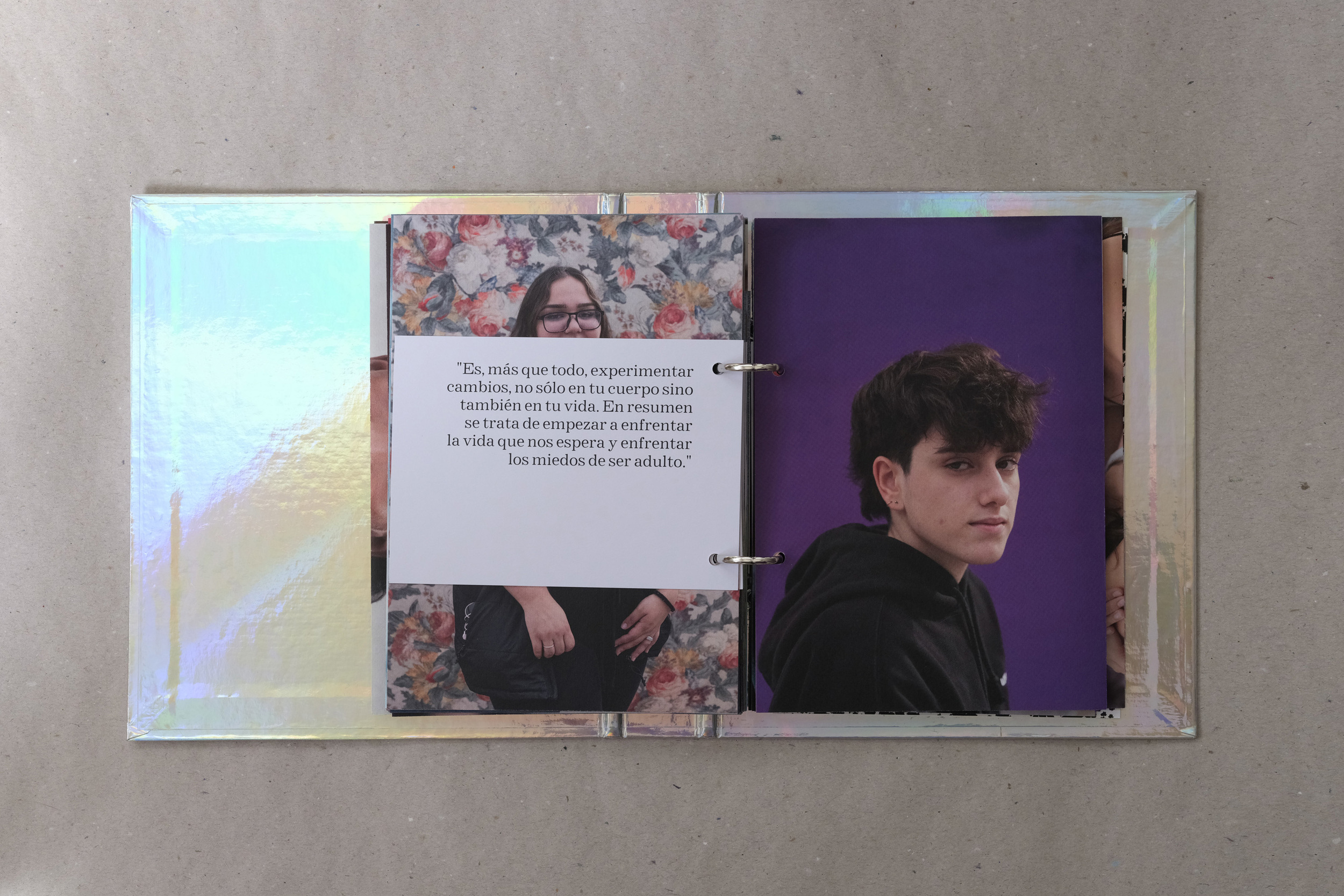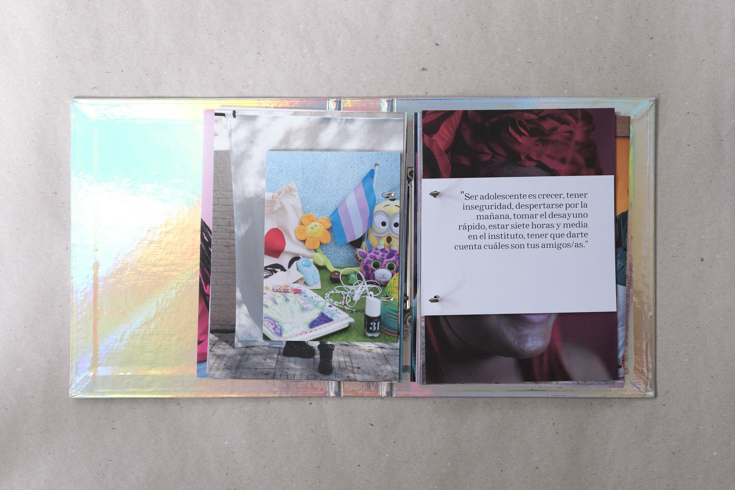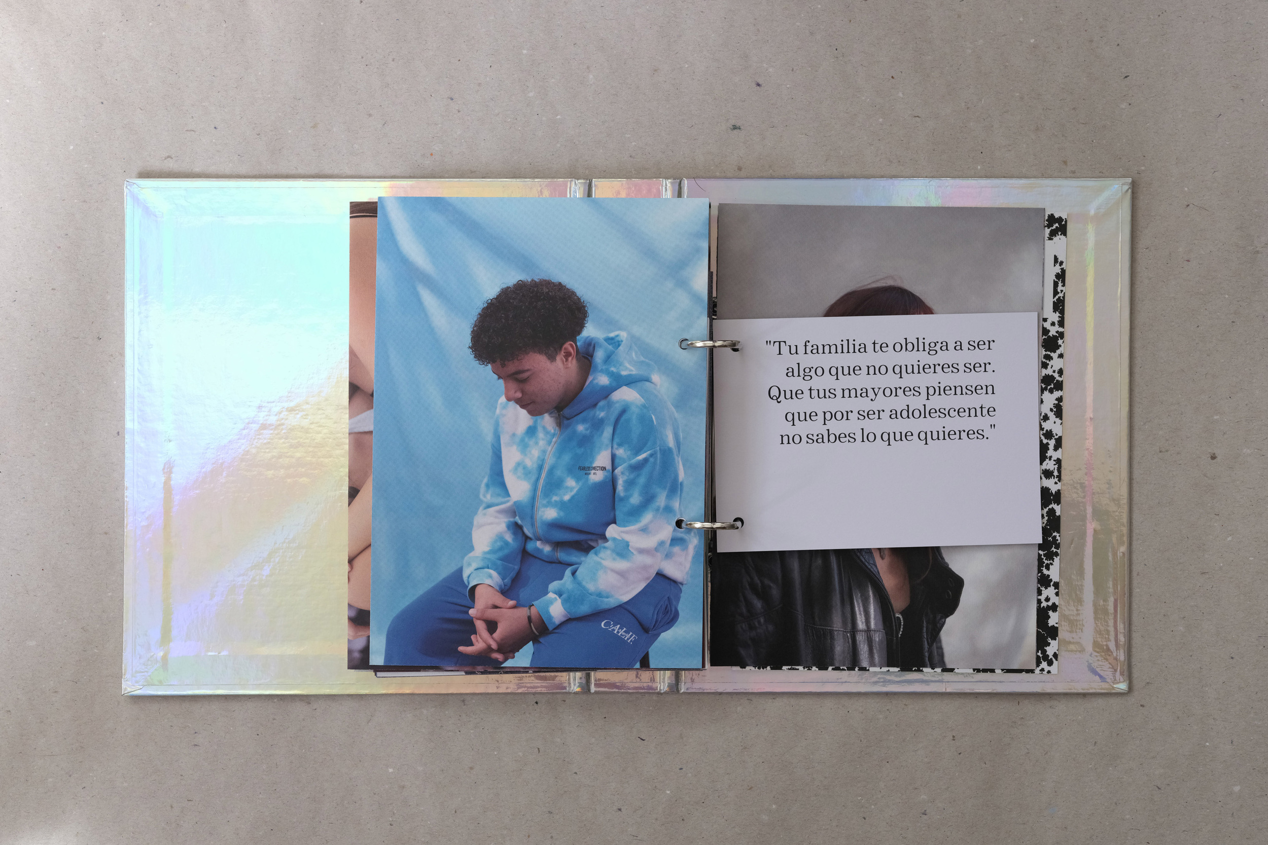 Un proyecto colectivo de autodefinición adolescente recogido en un archivador iridiscente con retratos, objetos y palabras en diferentes piezas, fichas y desplegables.