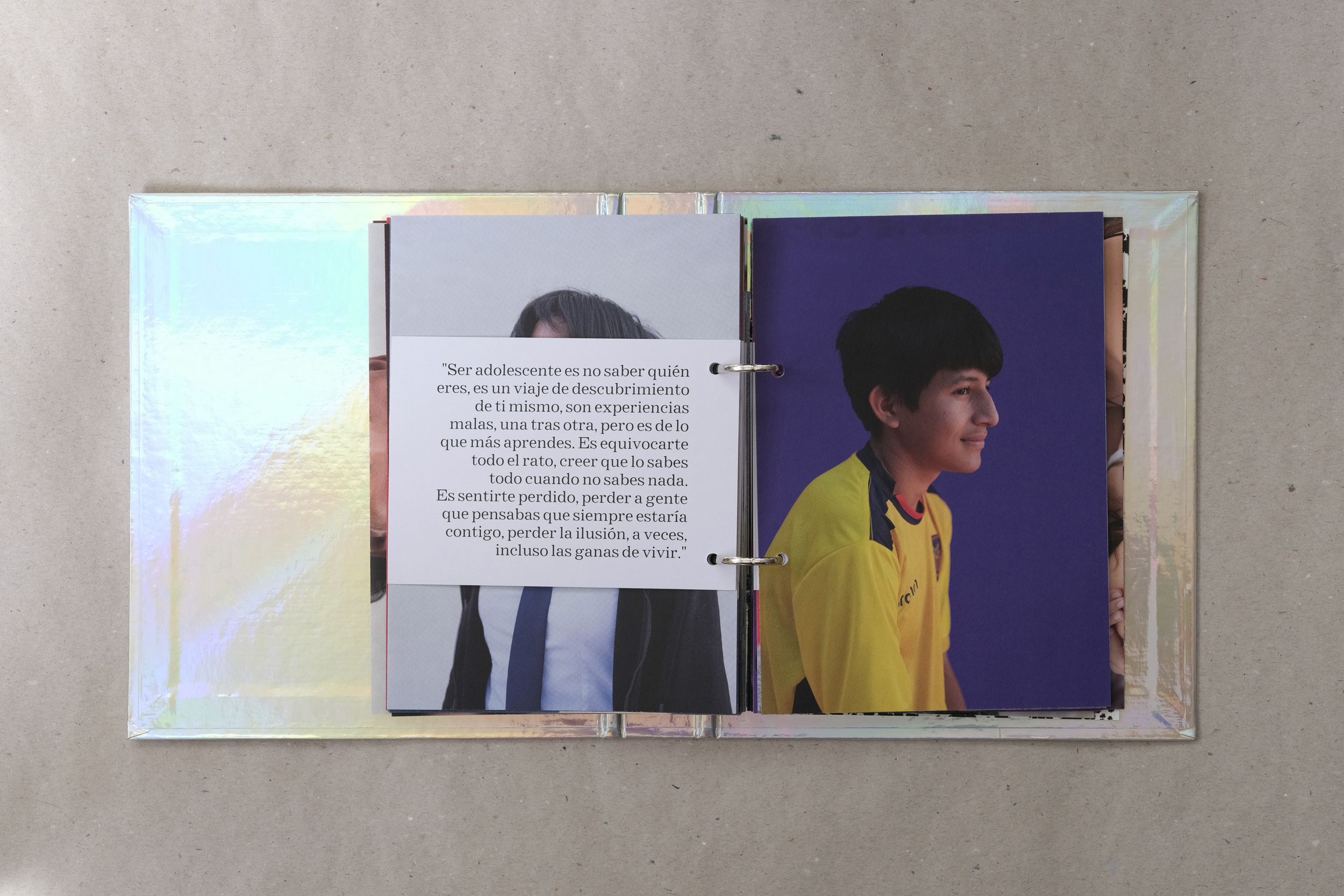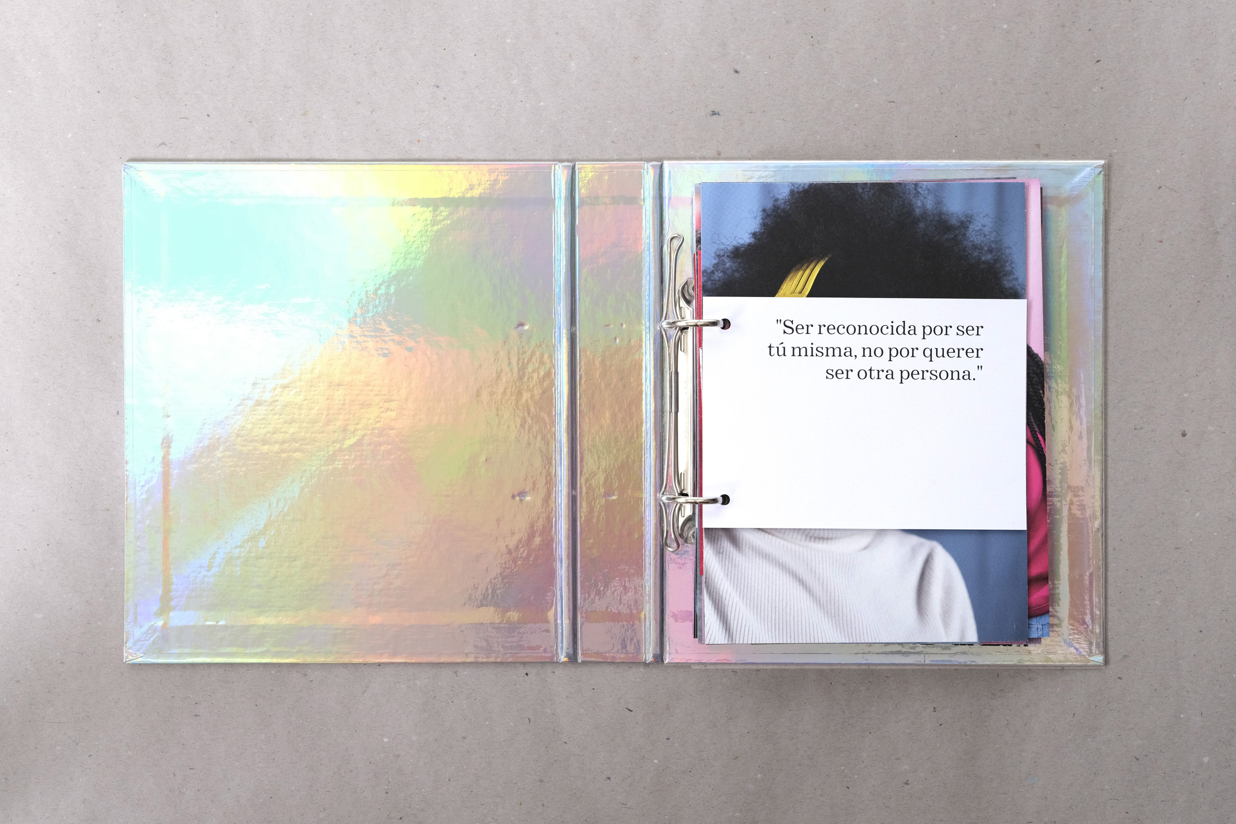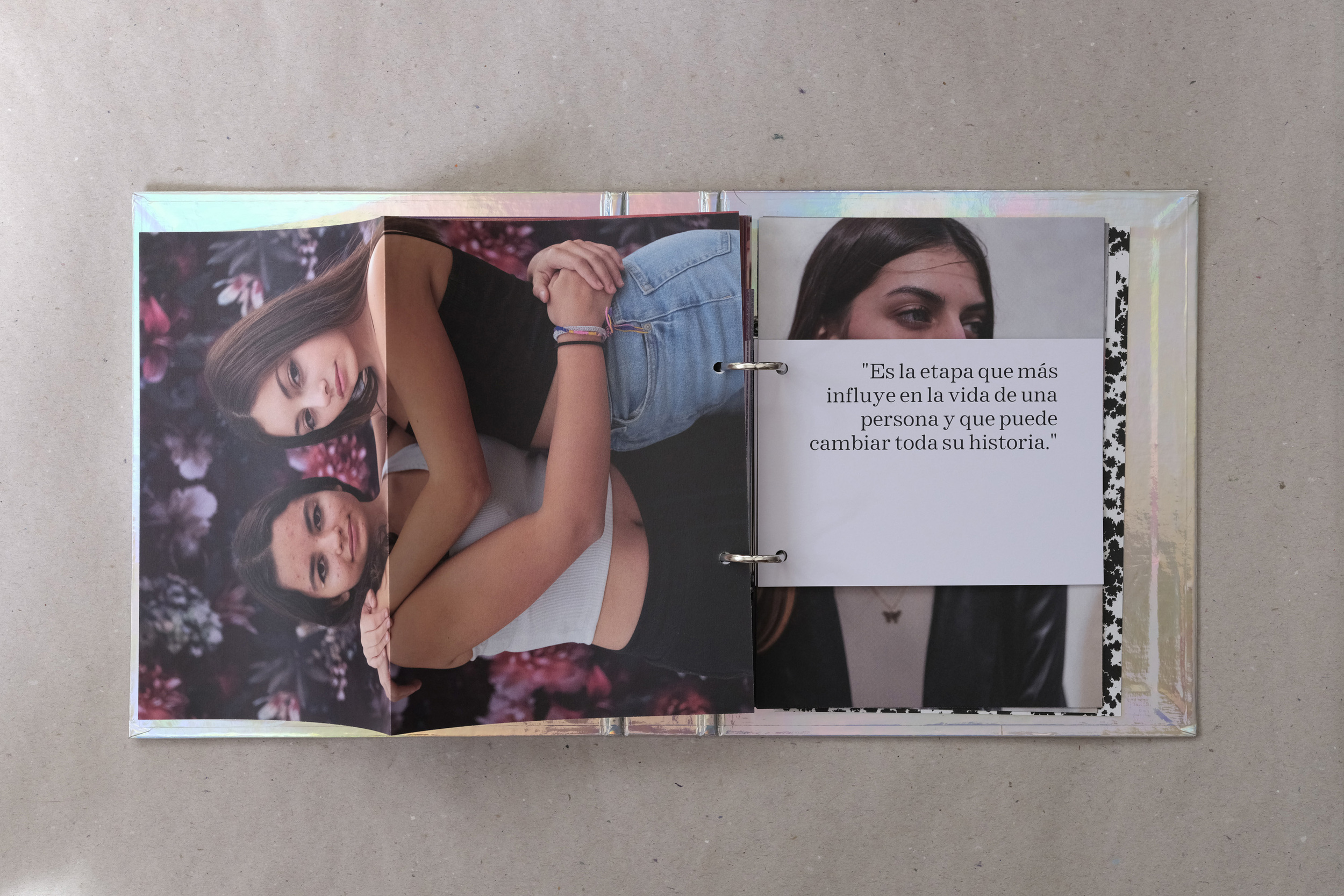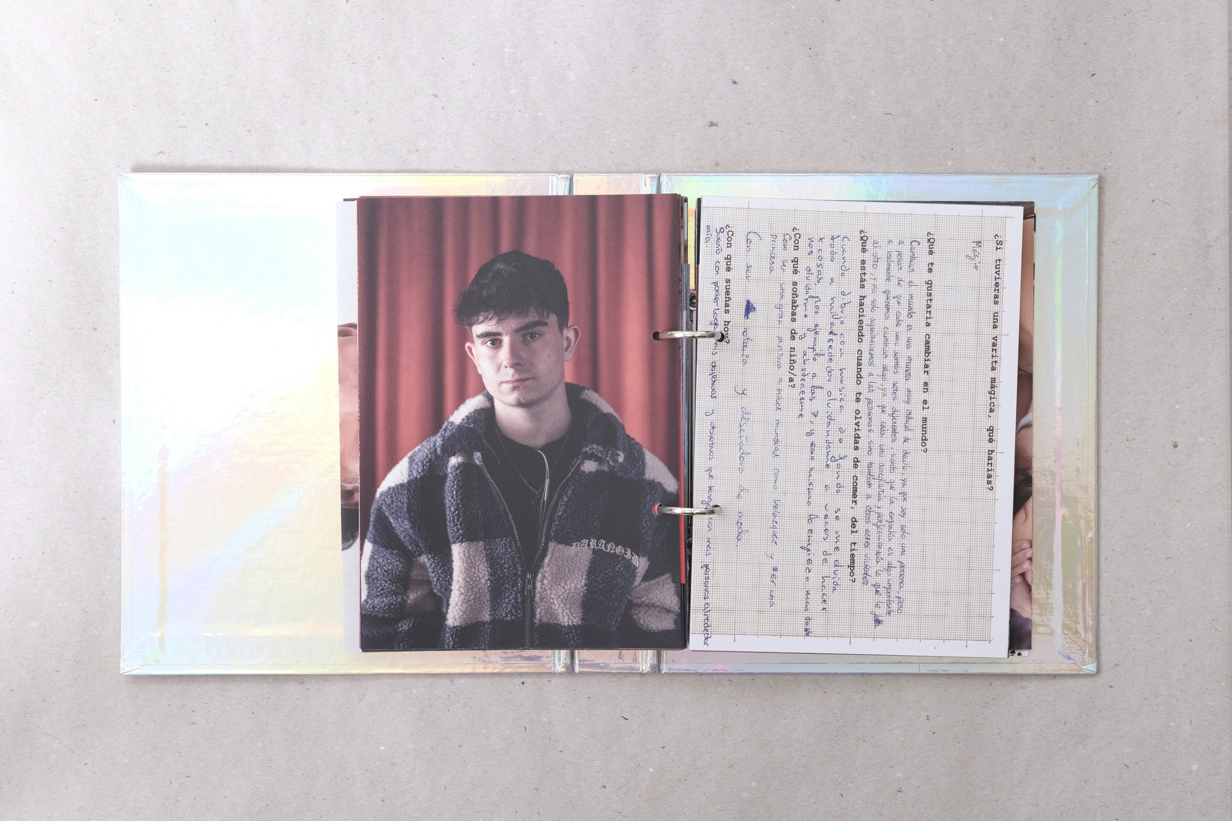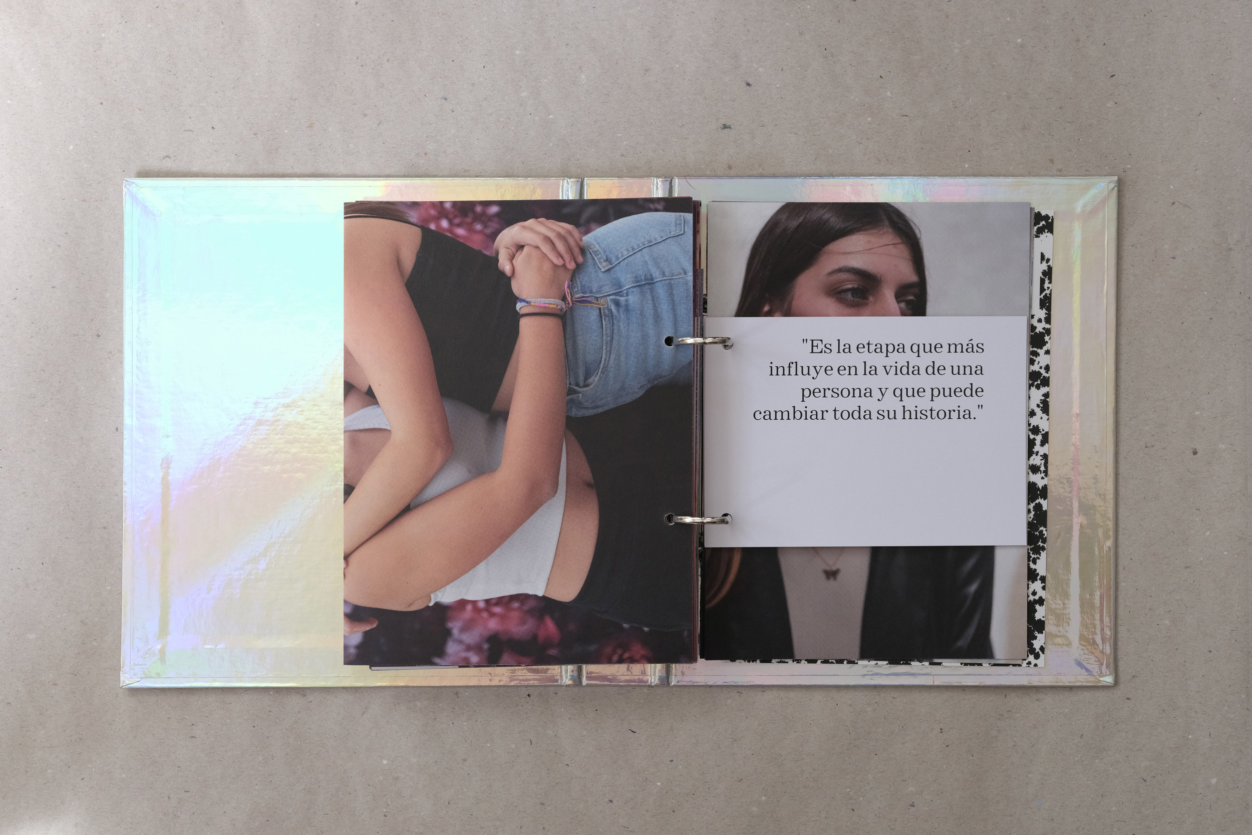 Un proyecto colectivo de autodefinición adolescente recogido en un archivador iridiscente con retratos, objetos y palabras en diferentes piezas, fichas y desplegables.