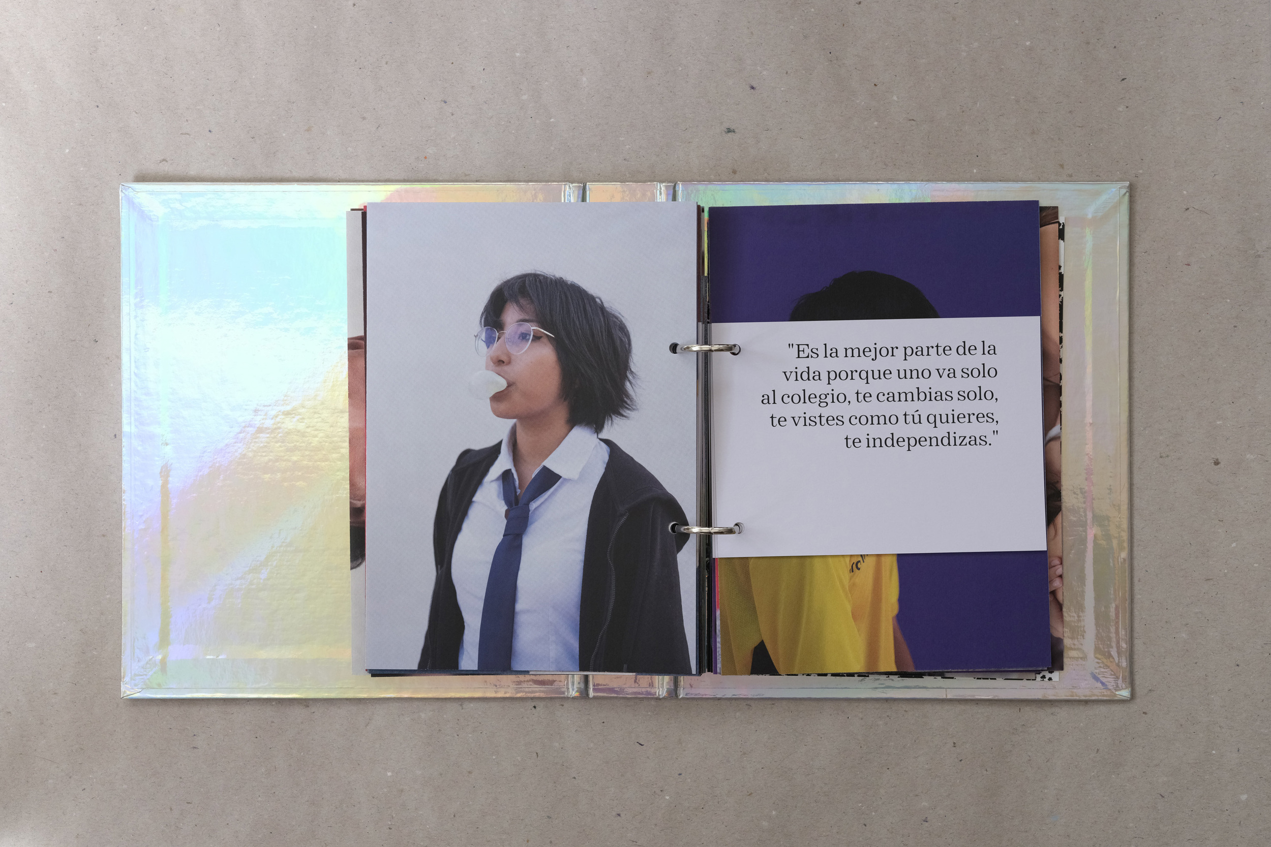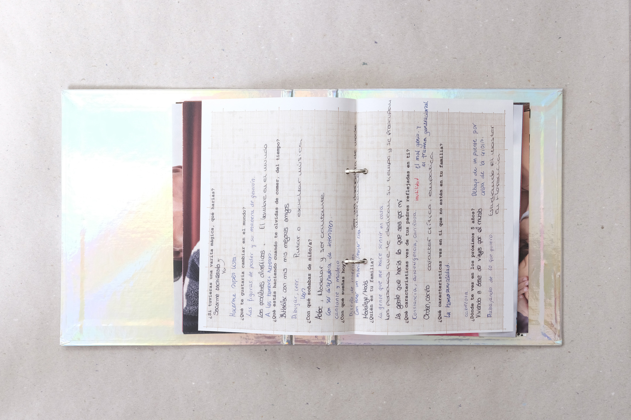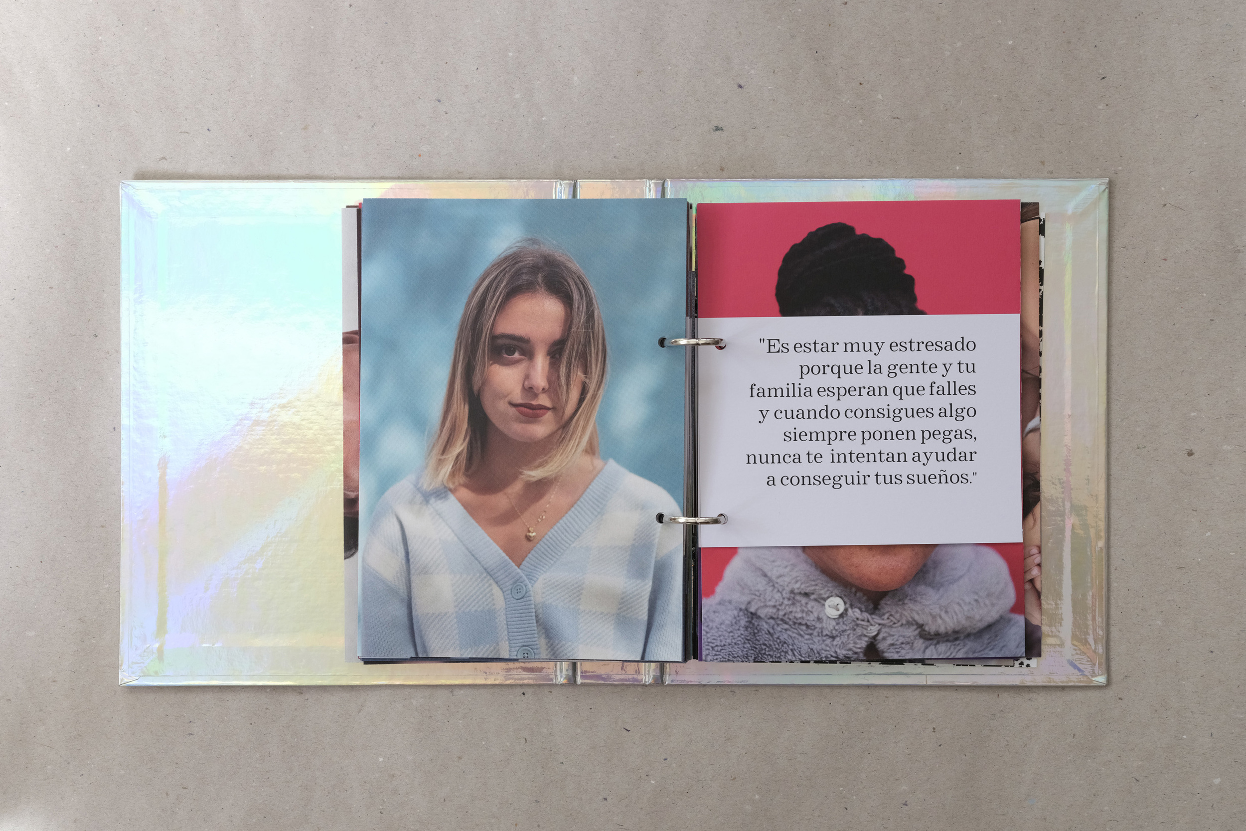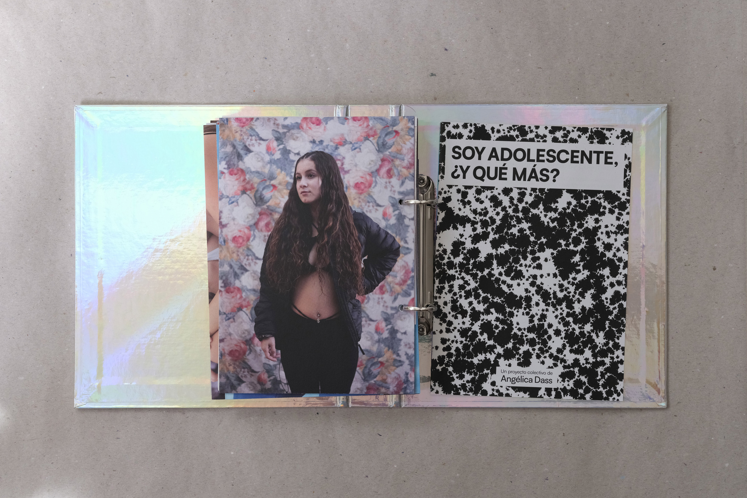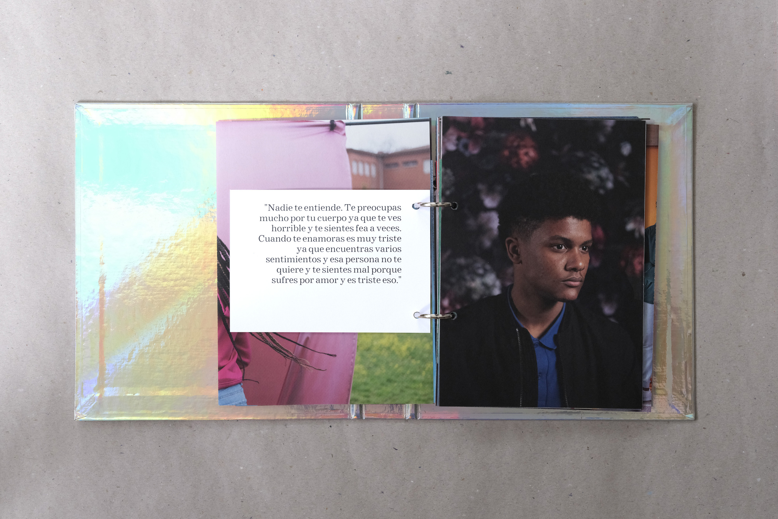 Un proyecto colectivo de autodefinición adolescente recogido en un archivador iridiscente con retratos, objetos y palabras en diferentes piezas, fichas y desplegables.