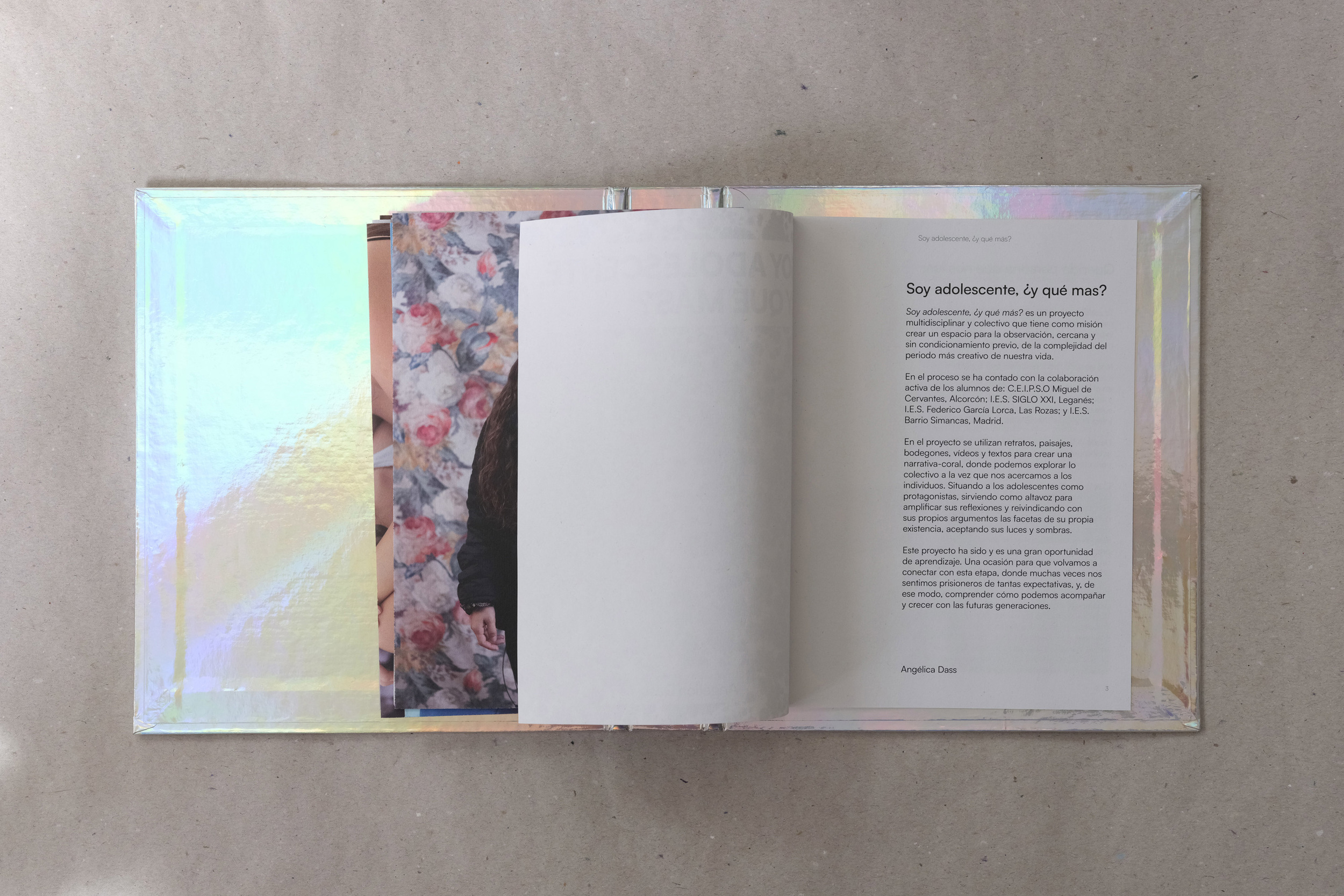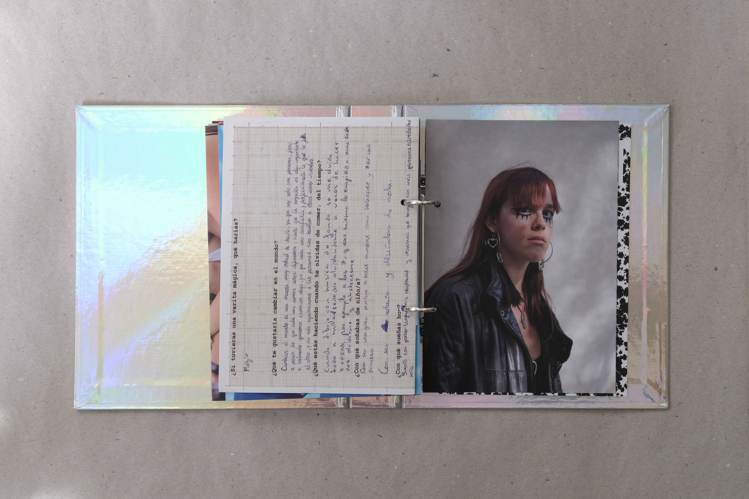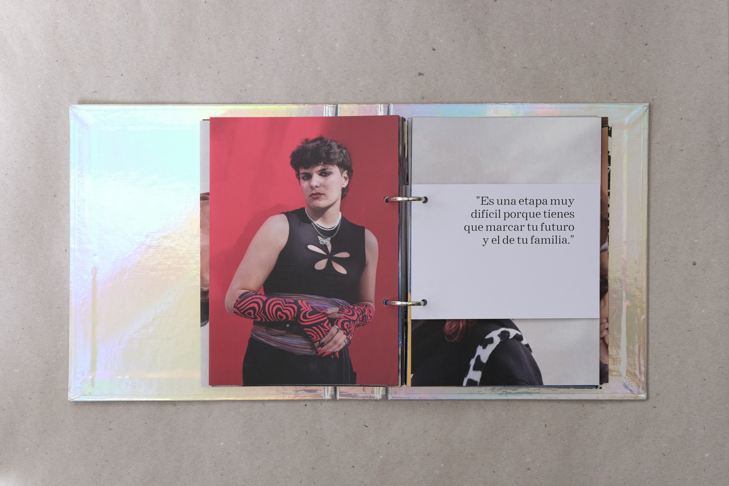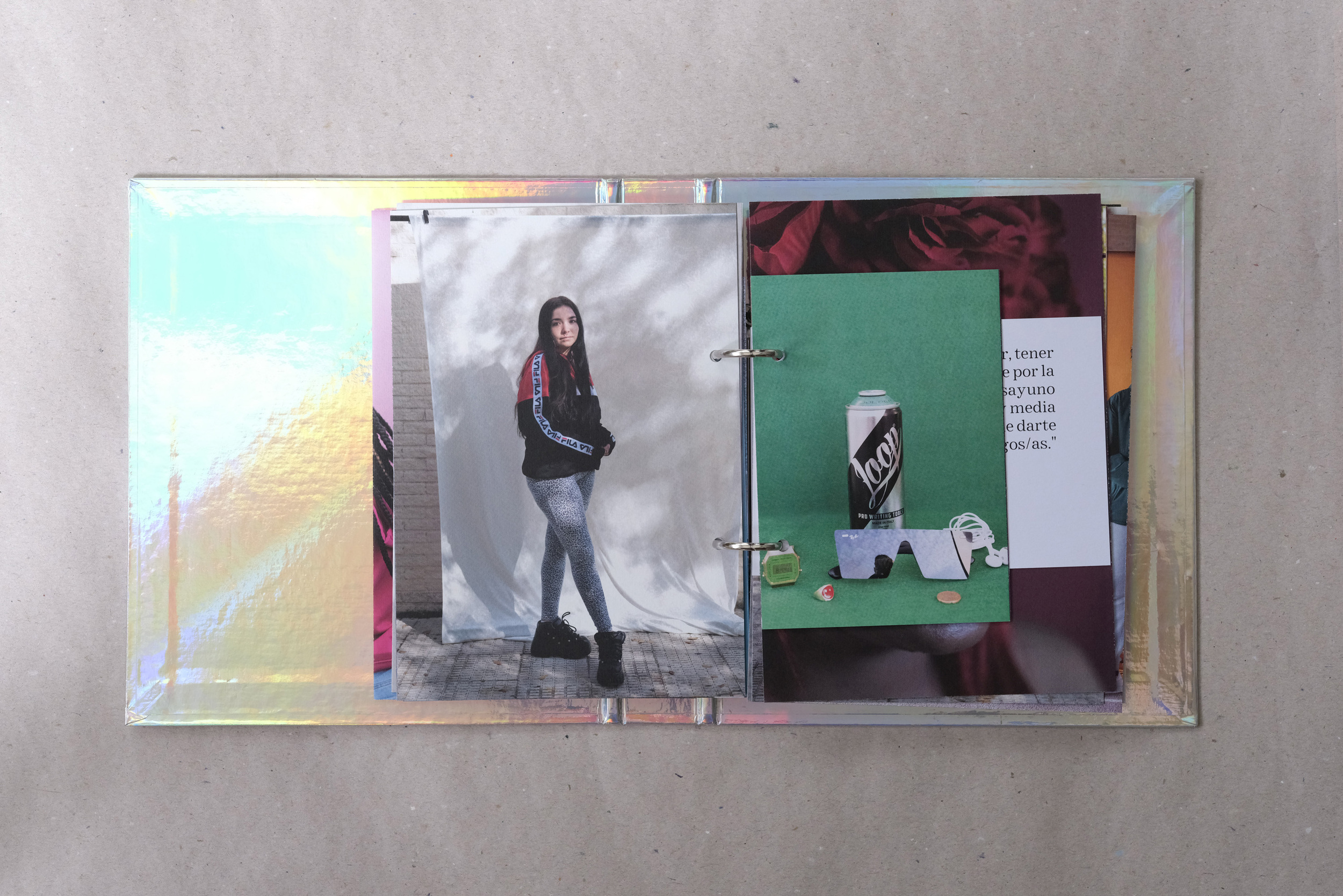 Un proyecto colectivo de autodefinición adolescente recogido en un archivador iridiscente con retratos, objetos y palabras en diferentes piezas, fichas y desplegables.