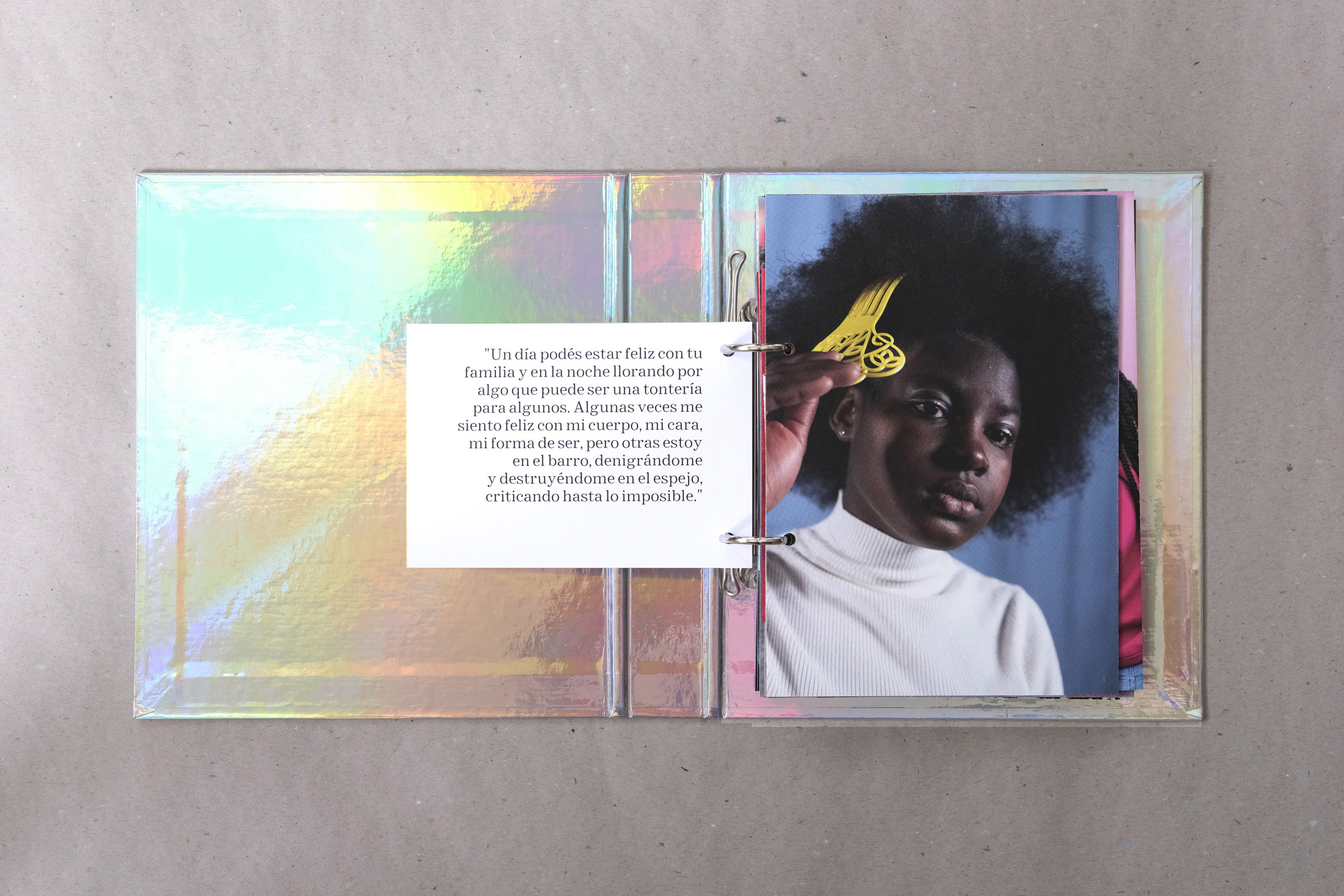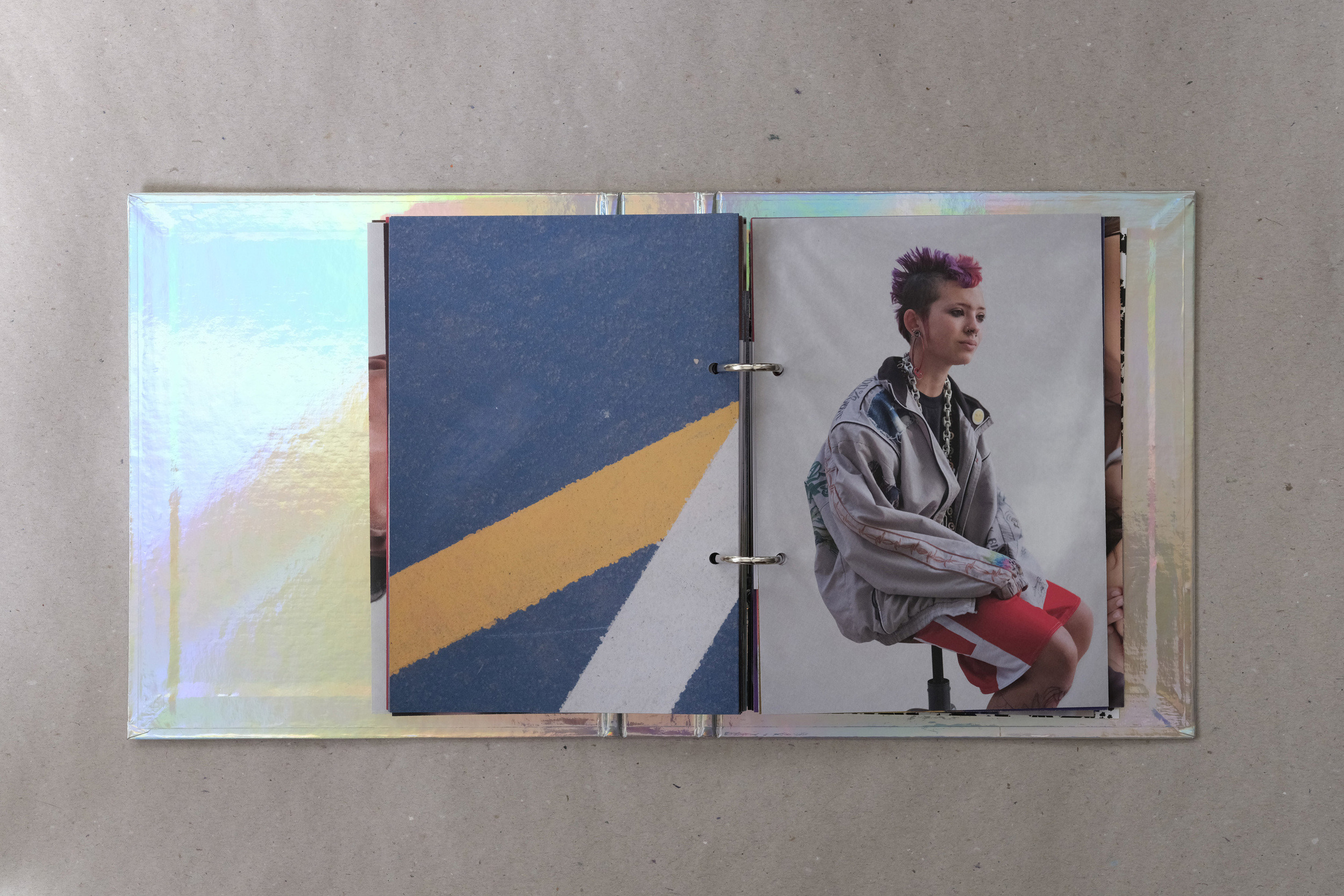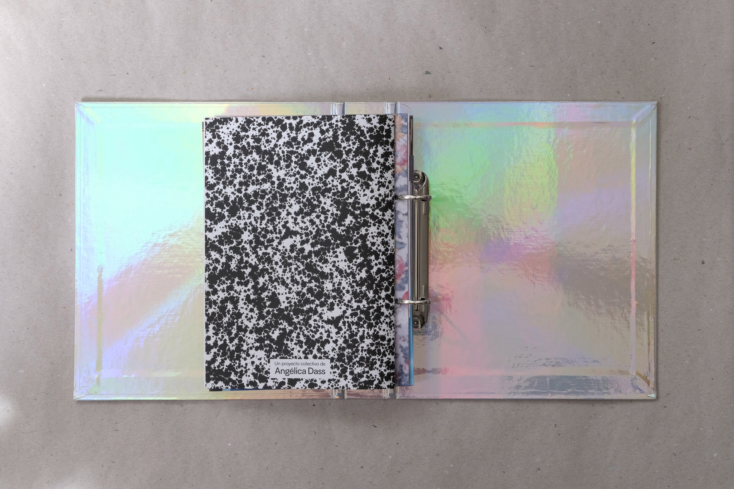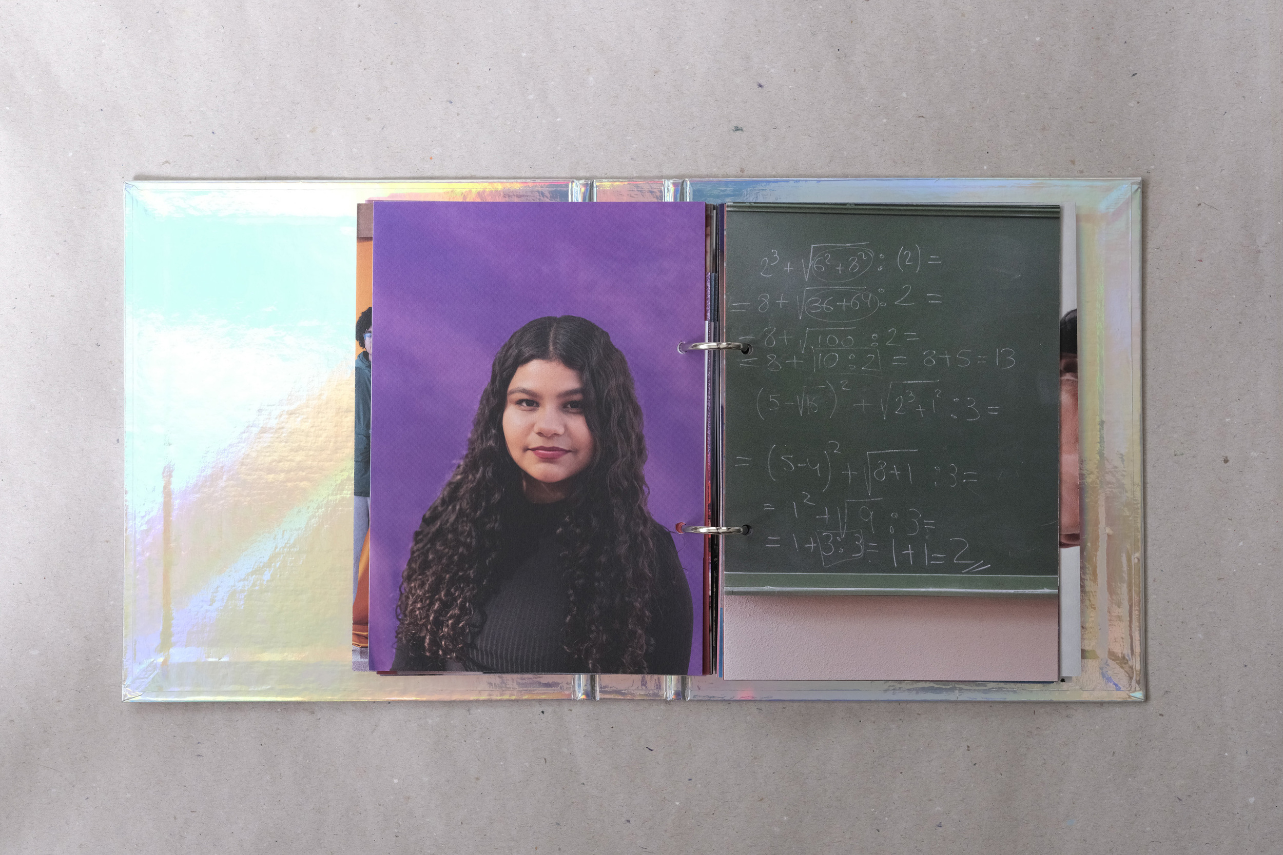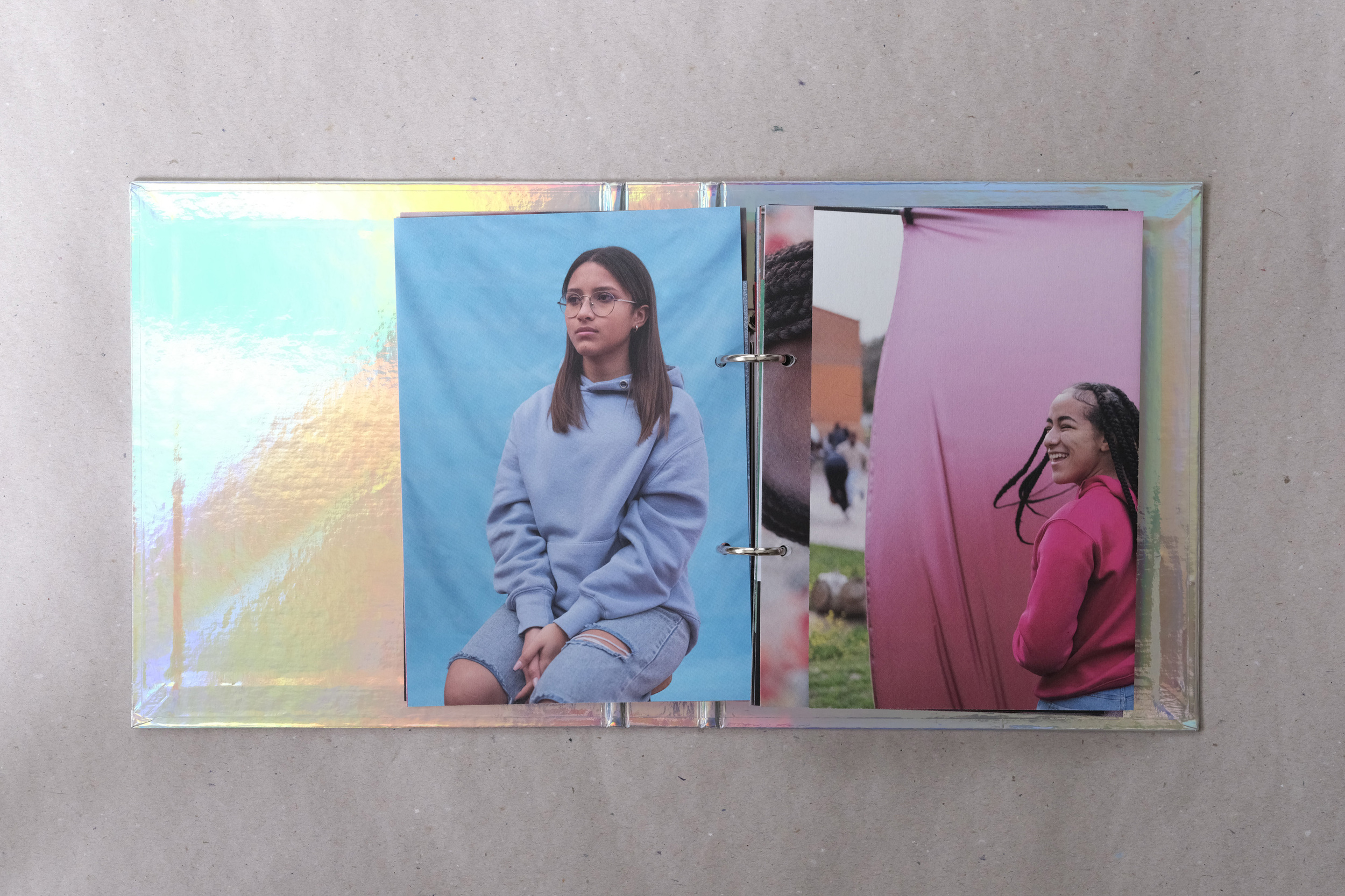 Un proyecto colectivo de autodefinición adolescente recogido en un archivador iridiscente con retratos, objetos y palabras en diferentes piezas, fichas y desplegables.
