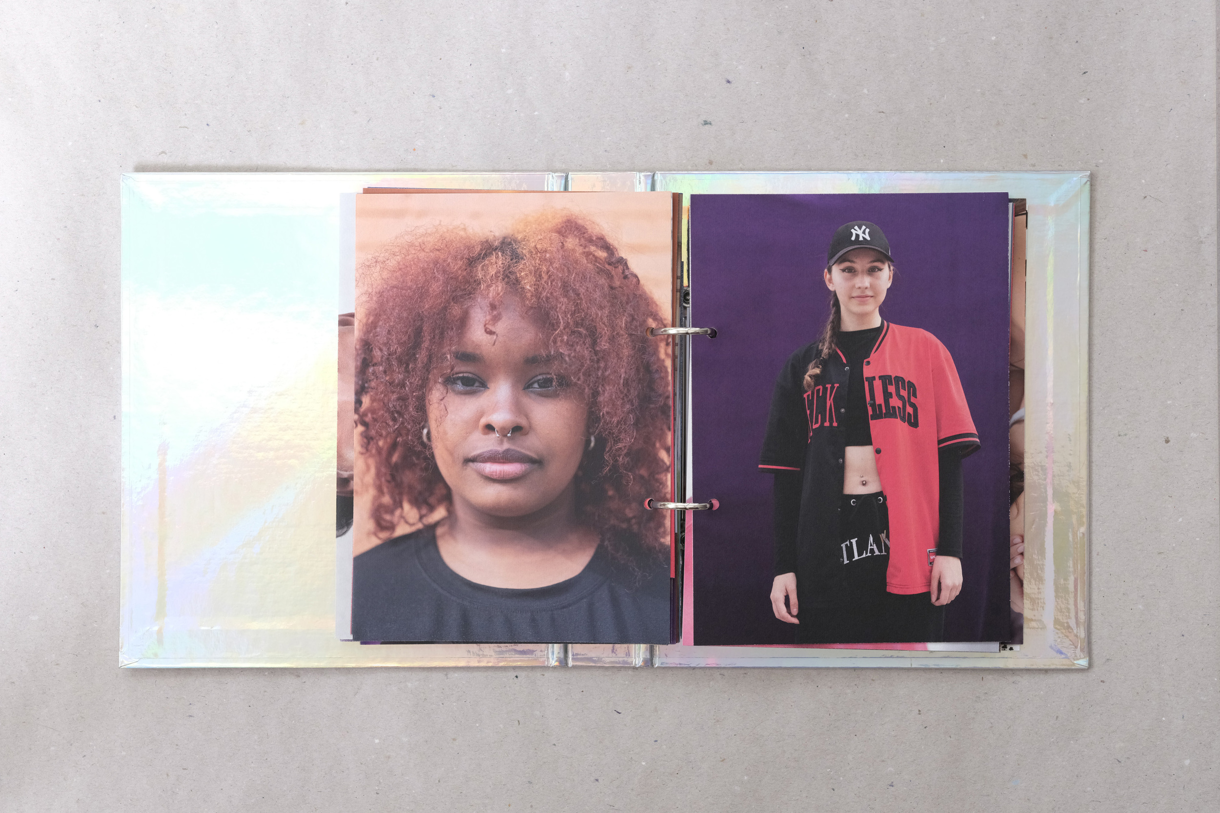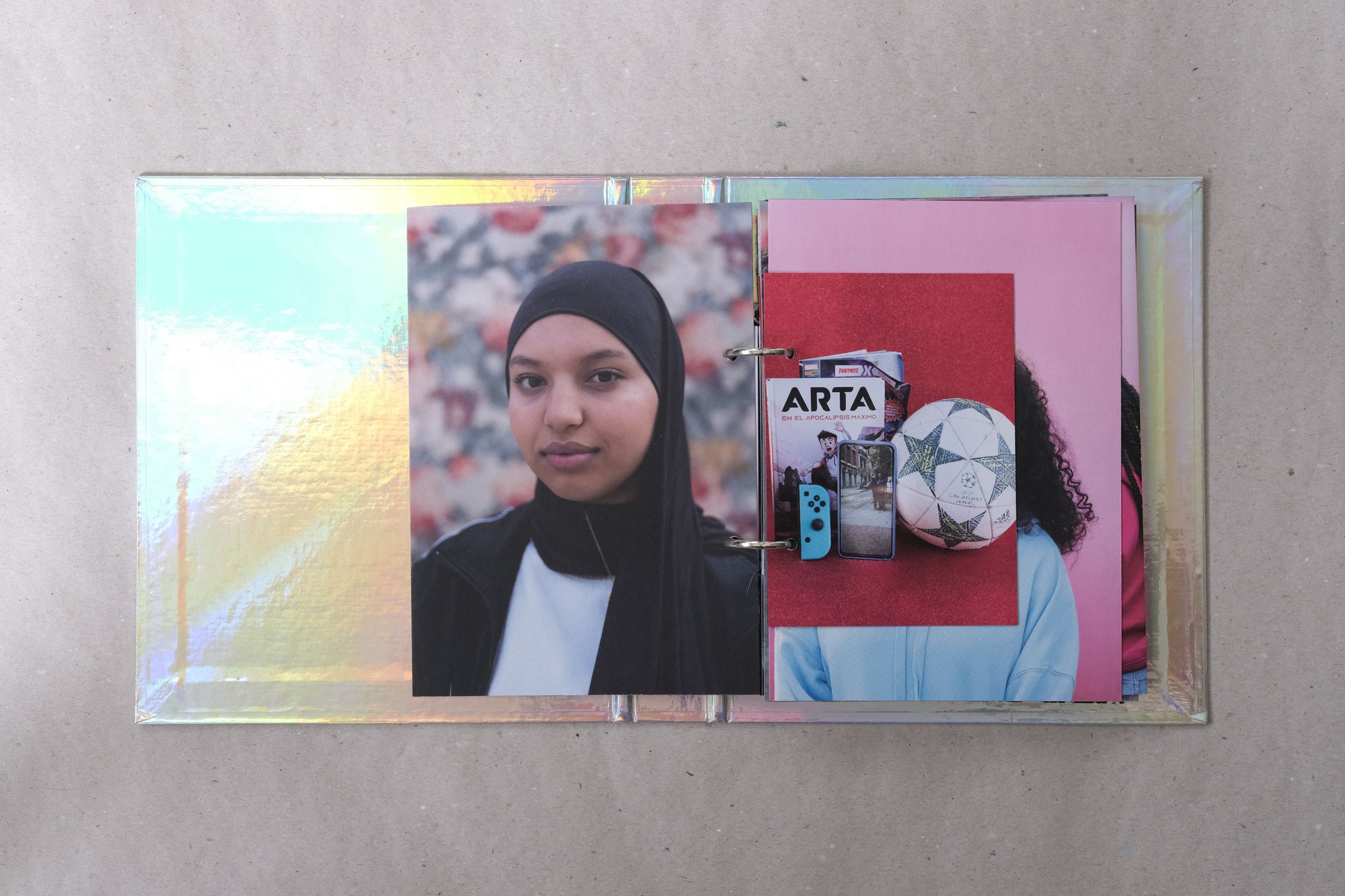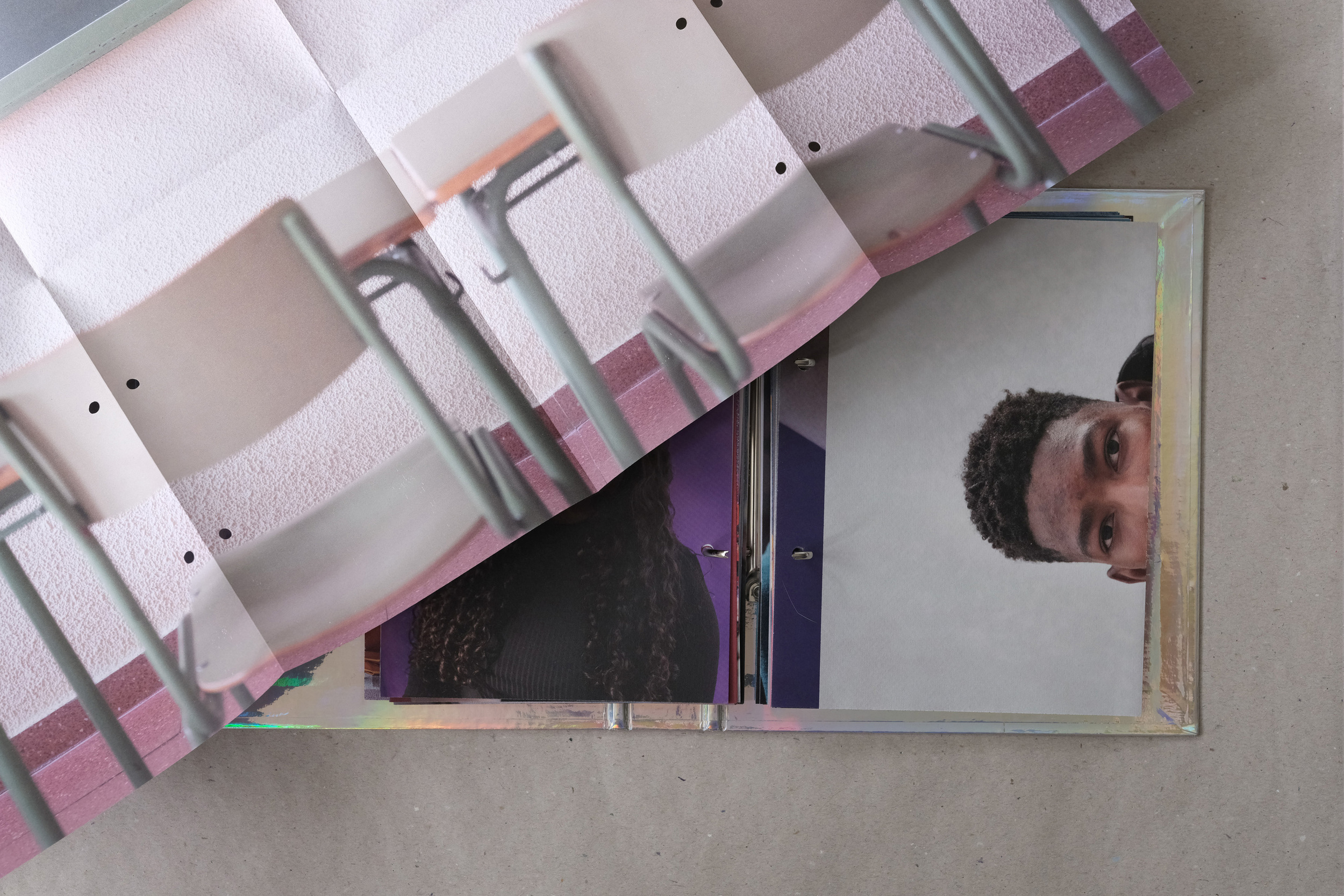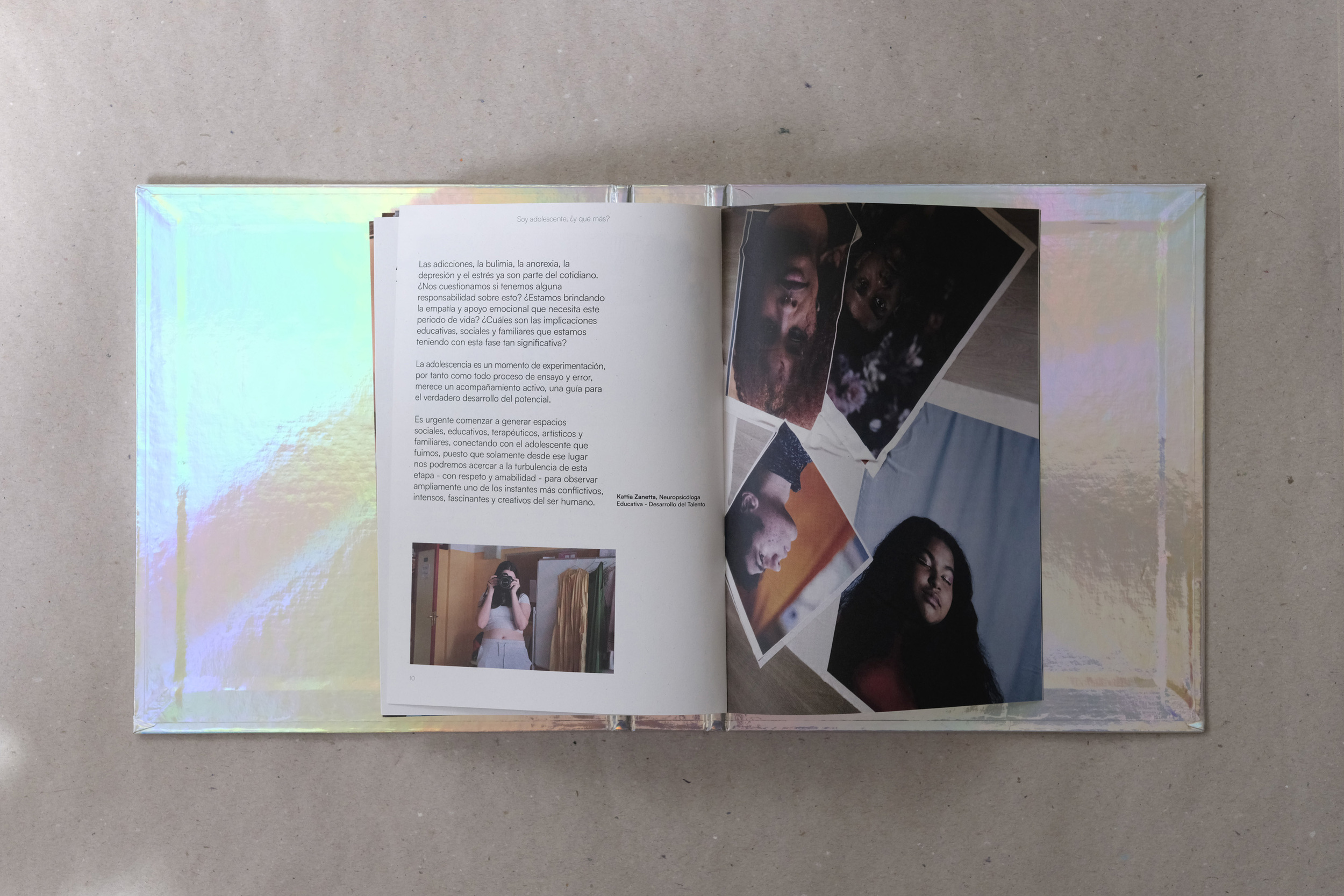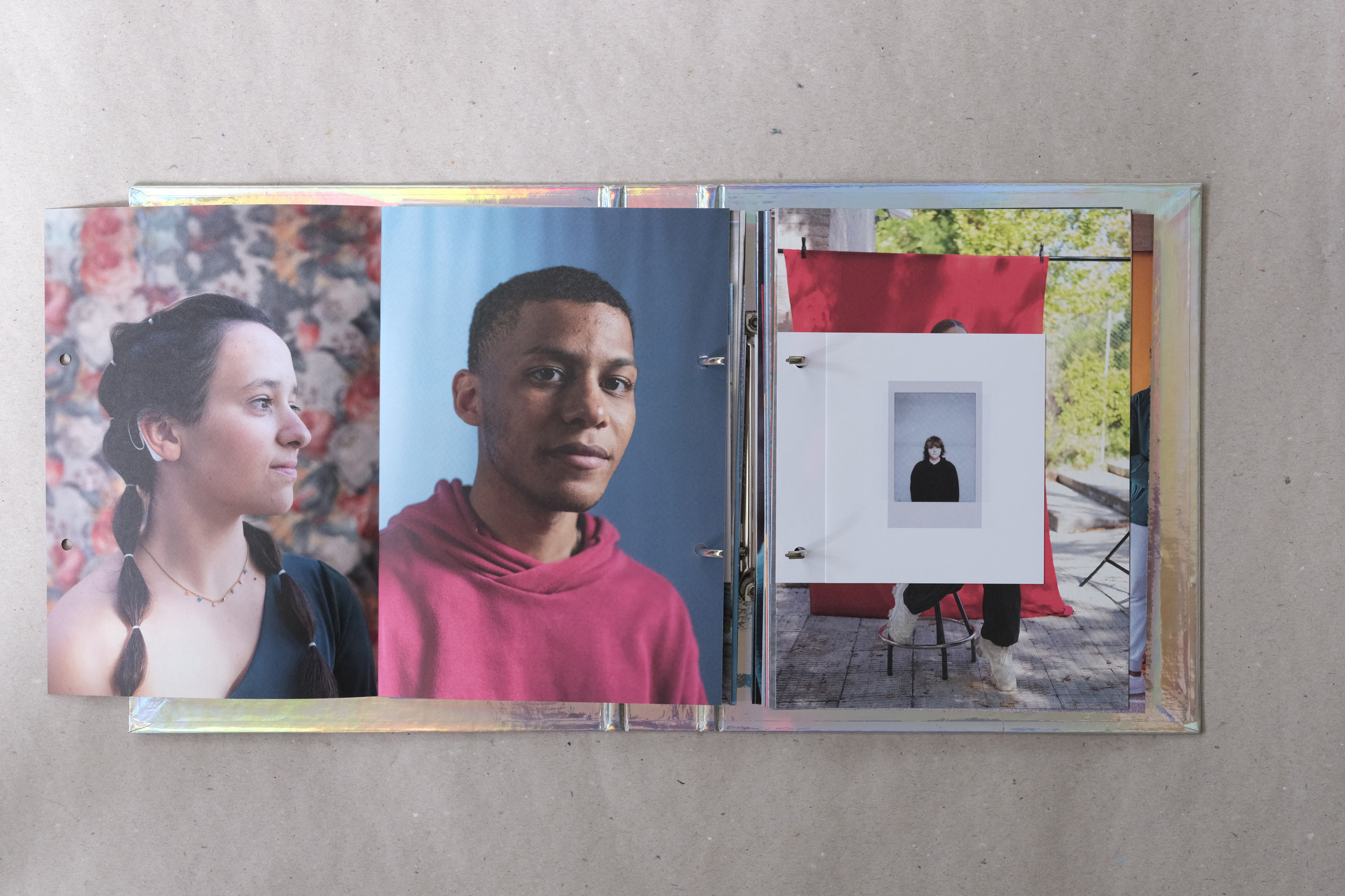 Un proyecto colectivo de autodefinición adolescente recogido en un archivador iridiscente con retratos, objetos y palabras en diferentes piezas, fichas y desplegables.