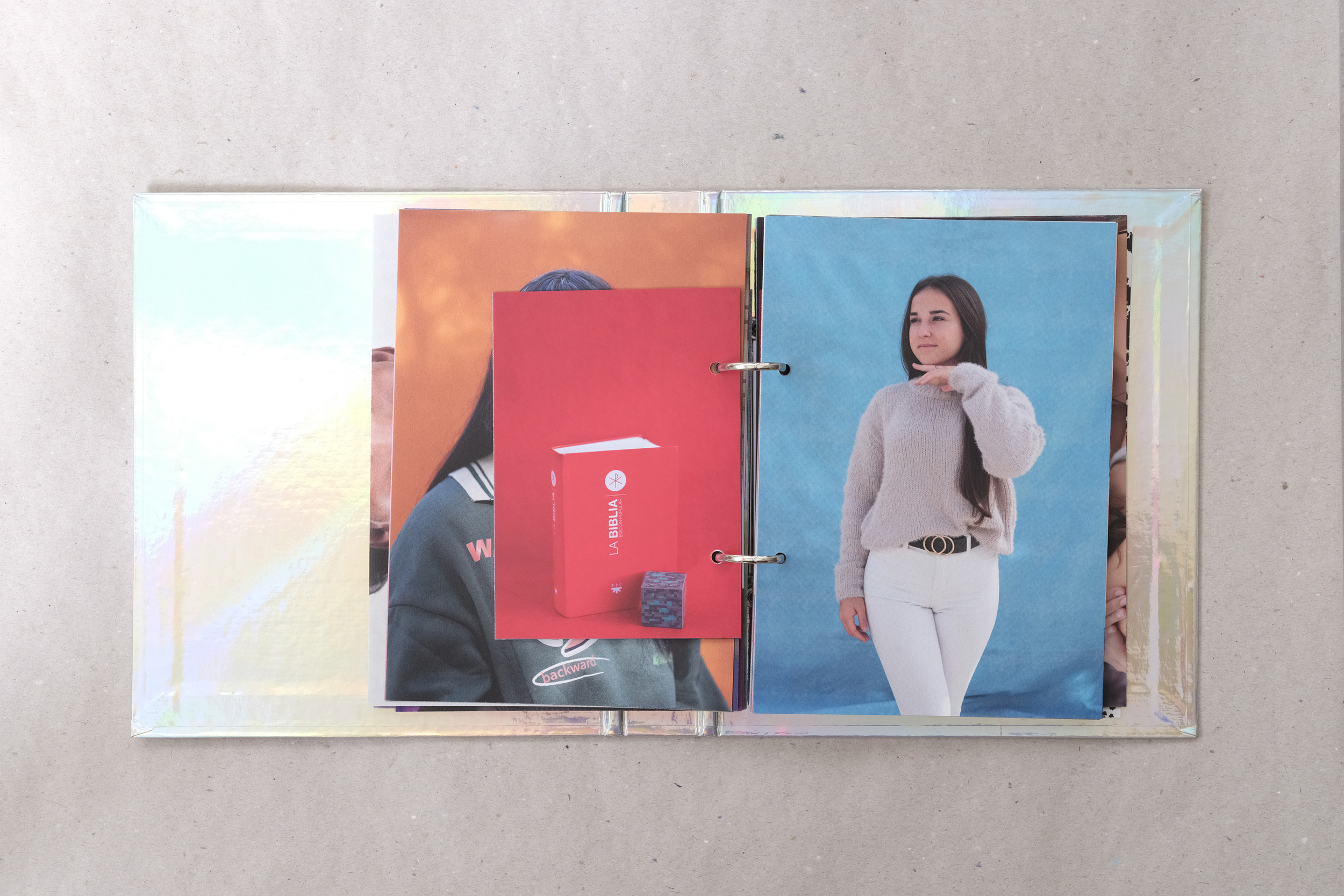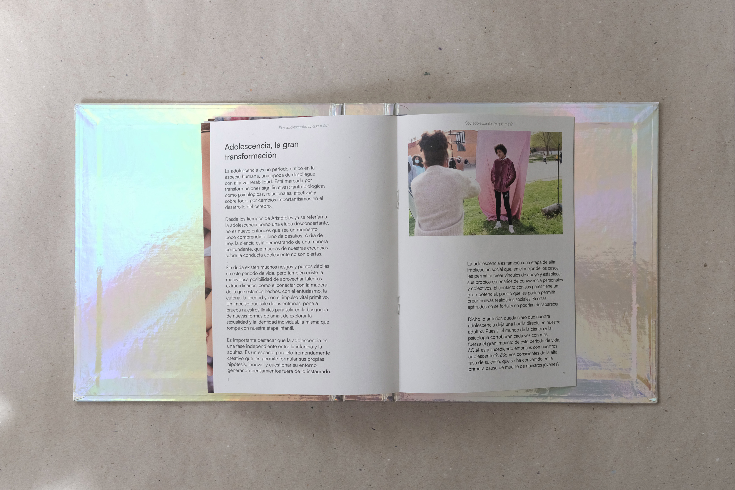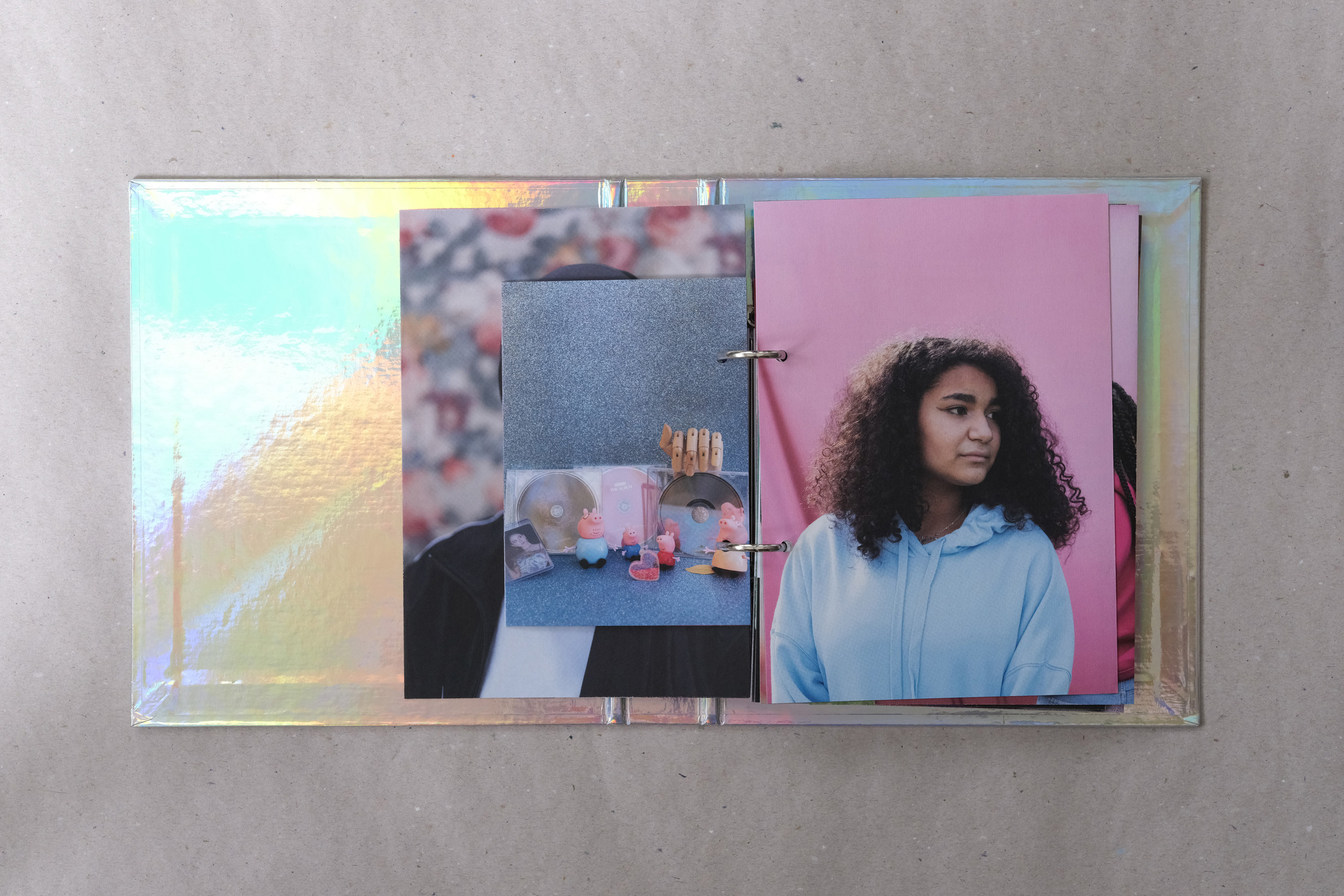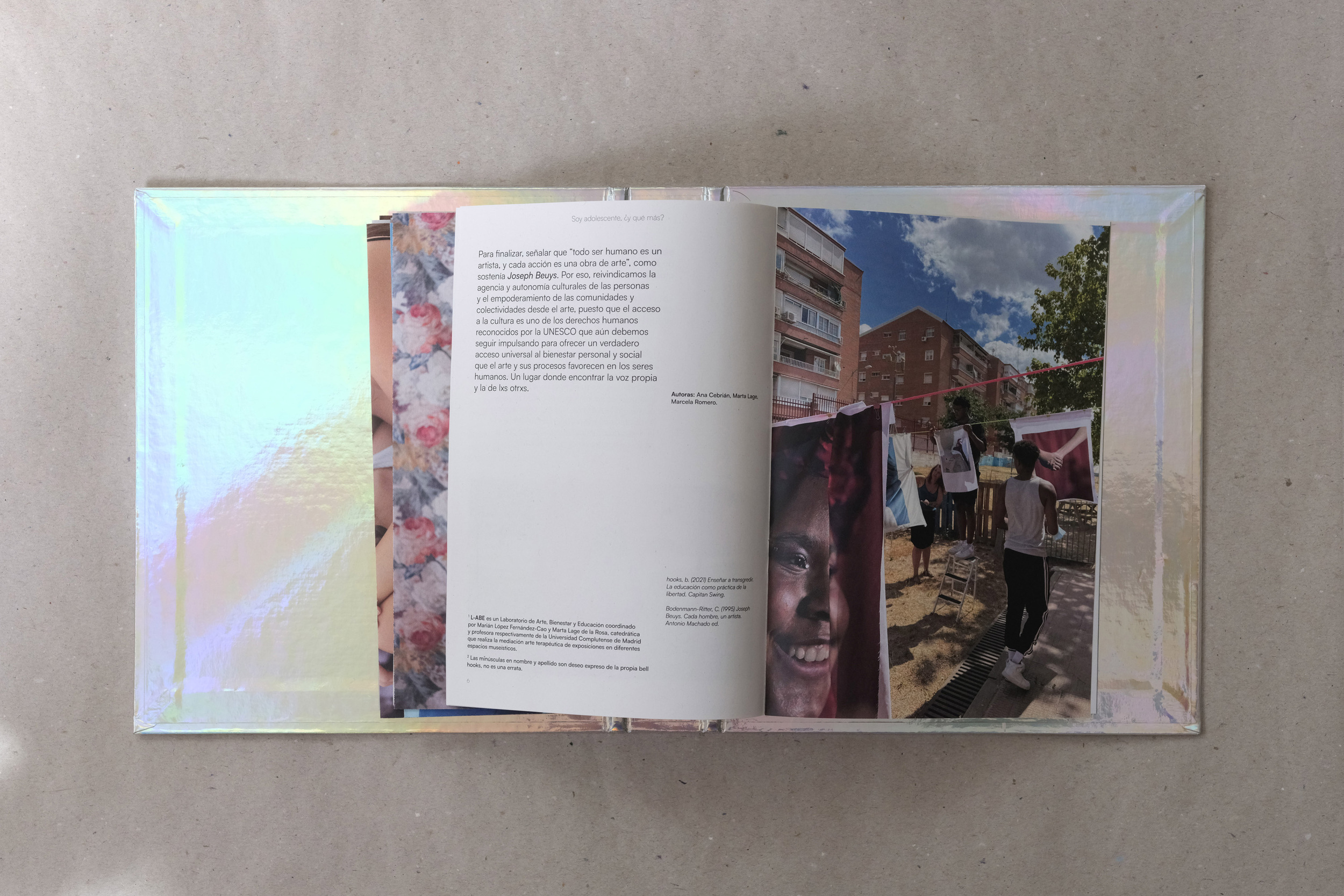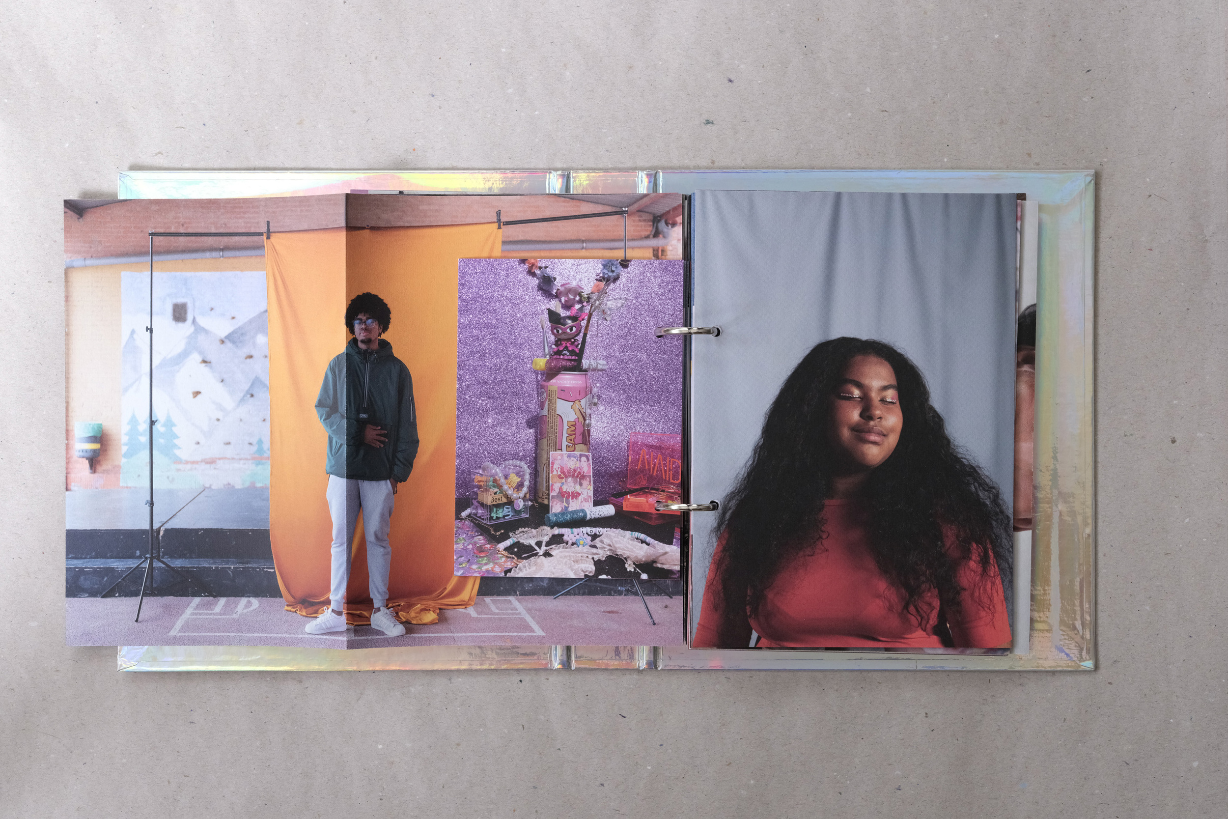 Un proyecto colectivo de autodefinición adolescente recogido en un archivador iridiscente con retratos, objetos y palabras en diferentes piezas, fichas y desplegables.