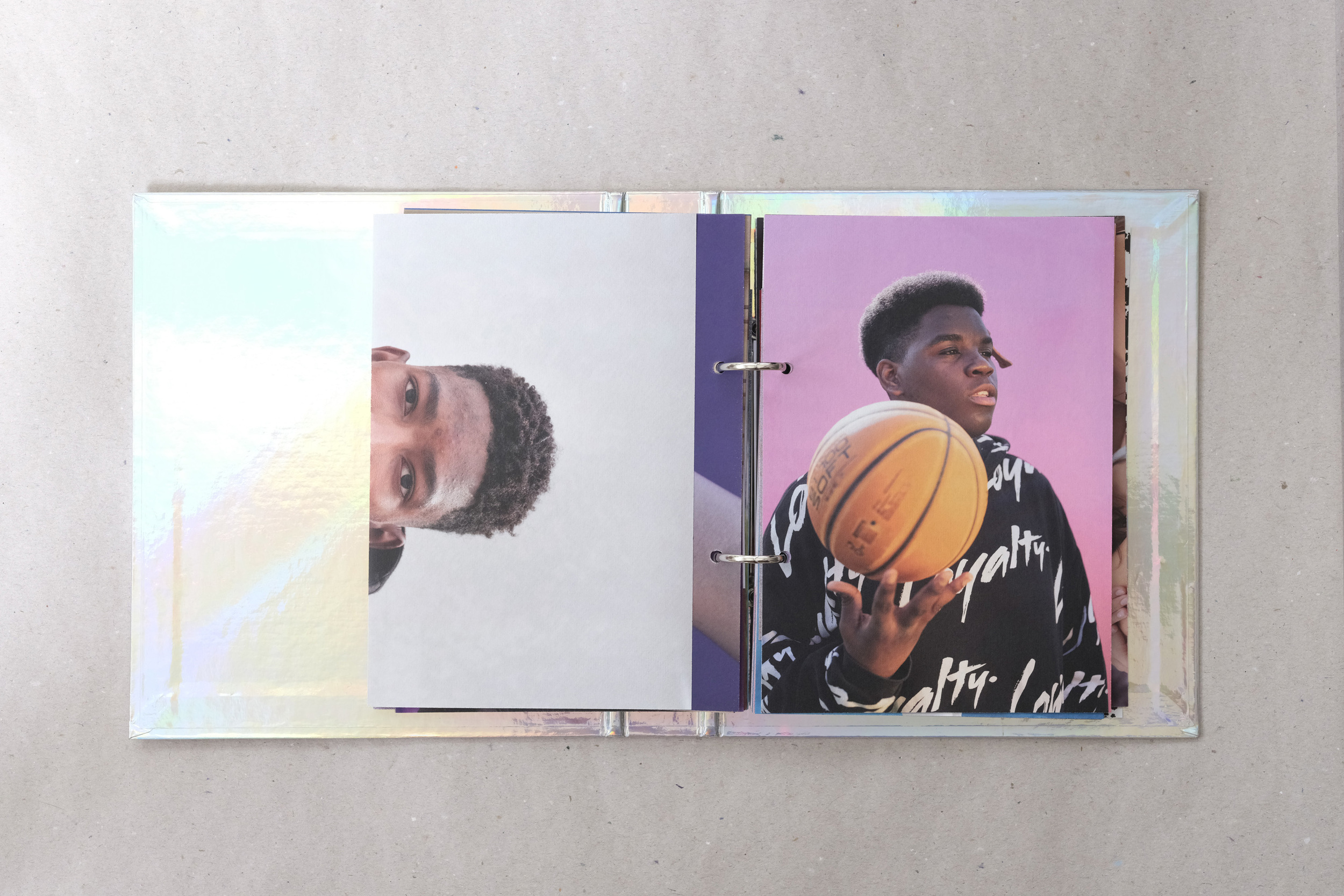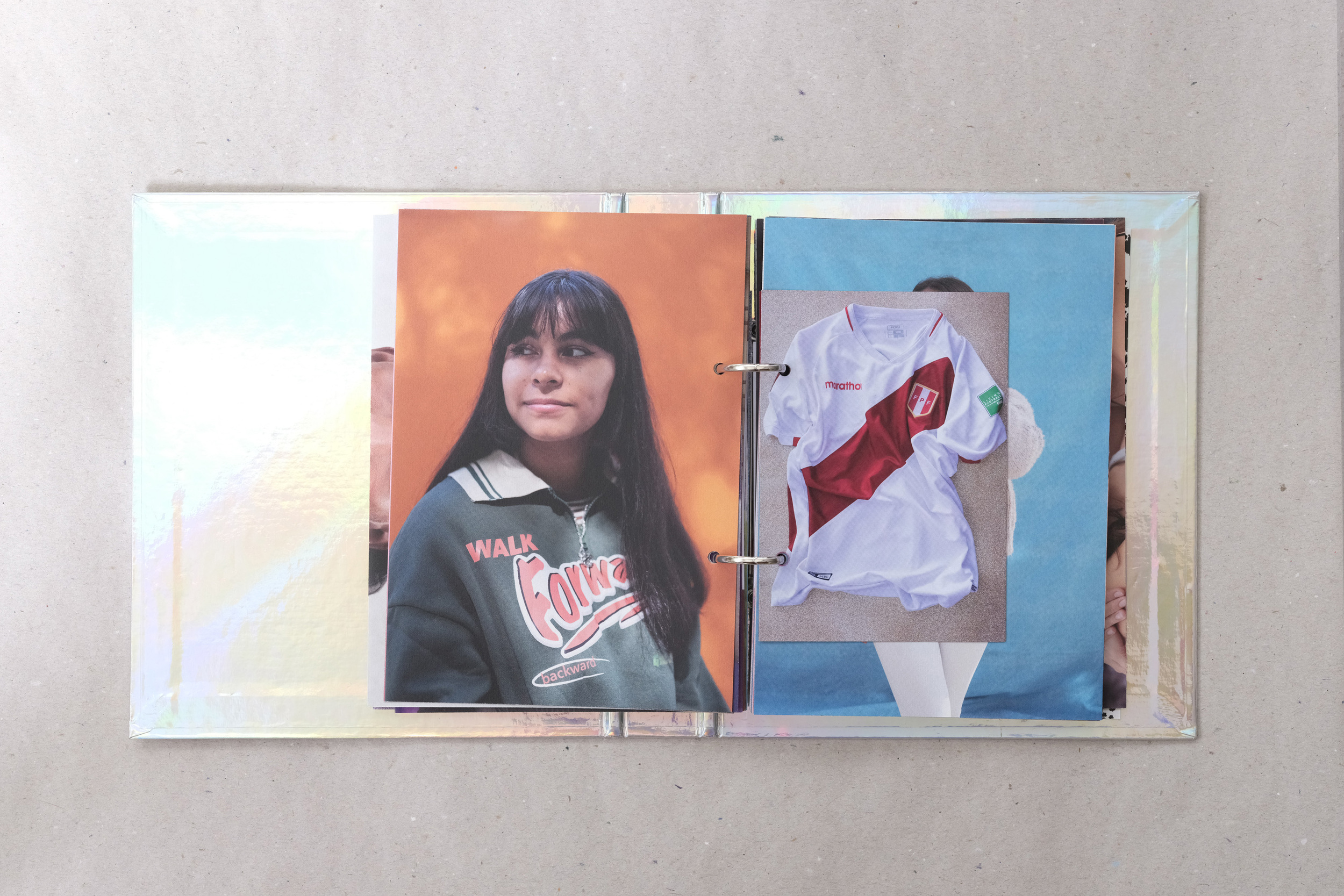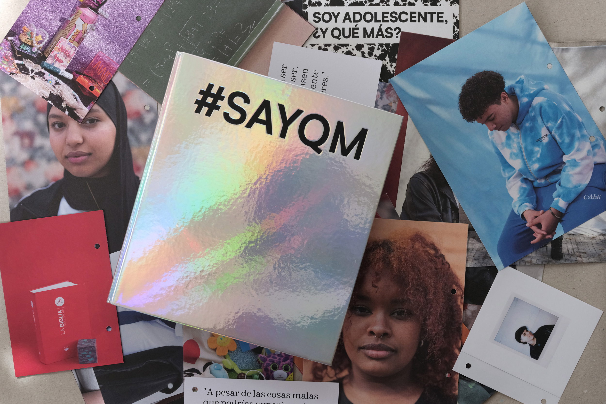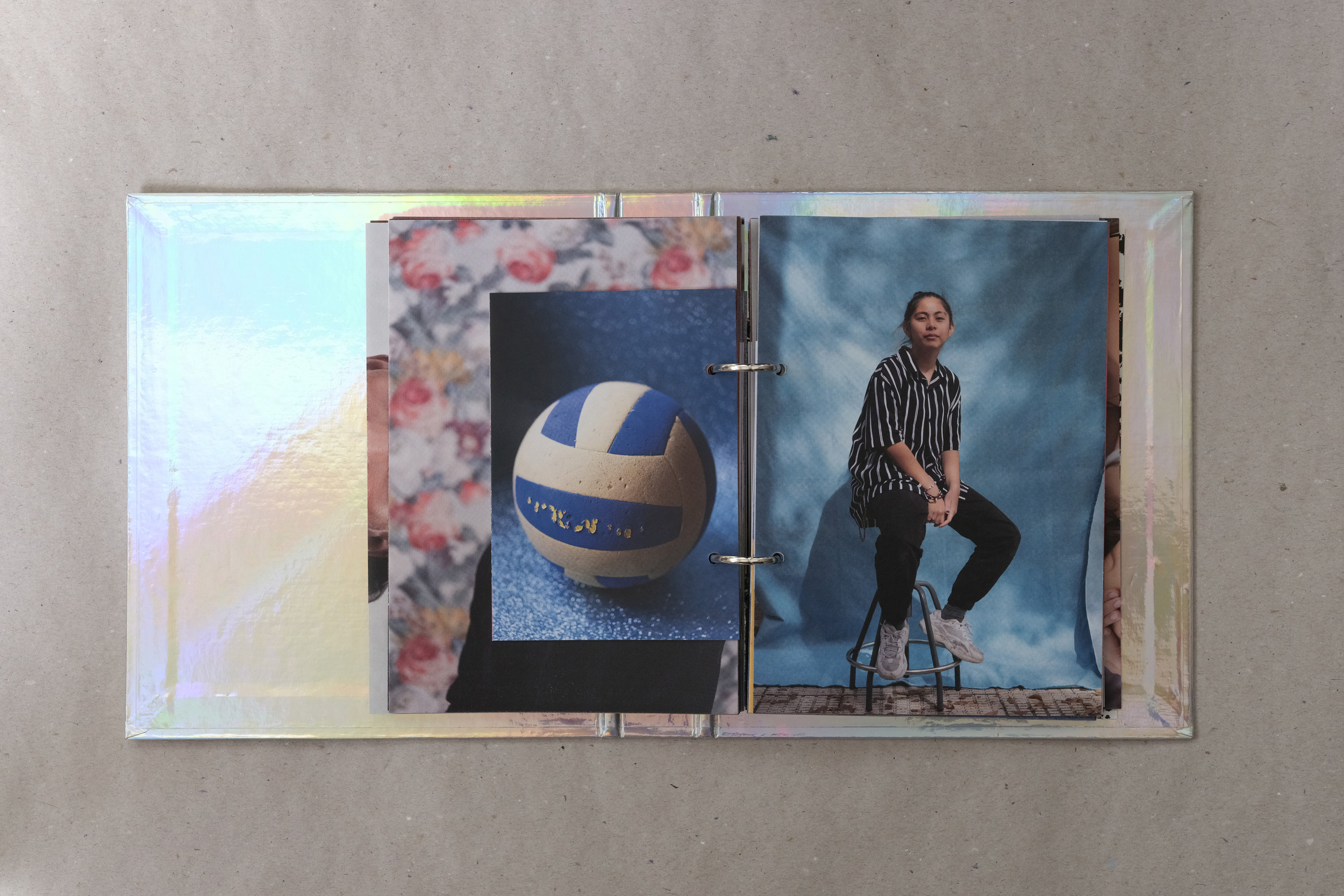 Un proyecto colectivo de autodefinición adolescente recogido en un archivador iridiscente con retratos, objetos y palabras en diferentes piezas, fichas y desplegables.